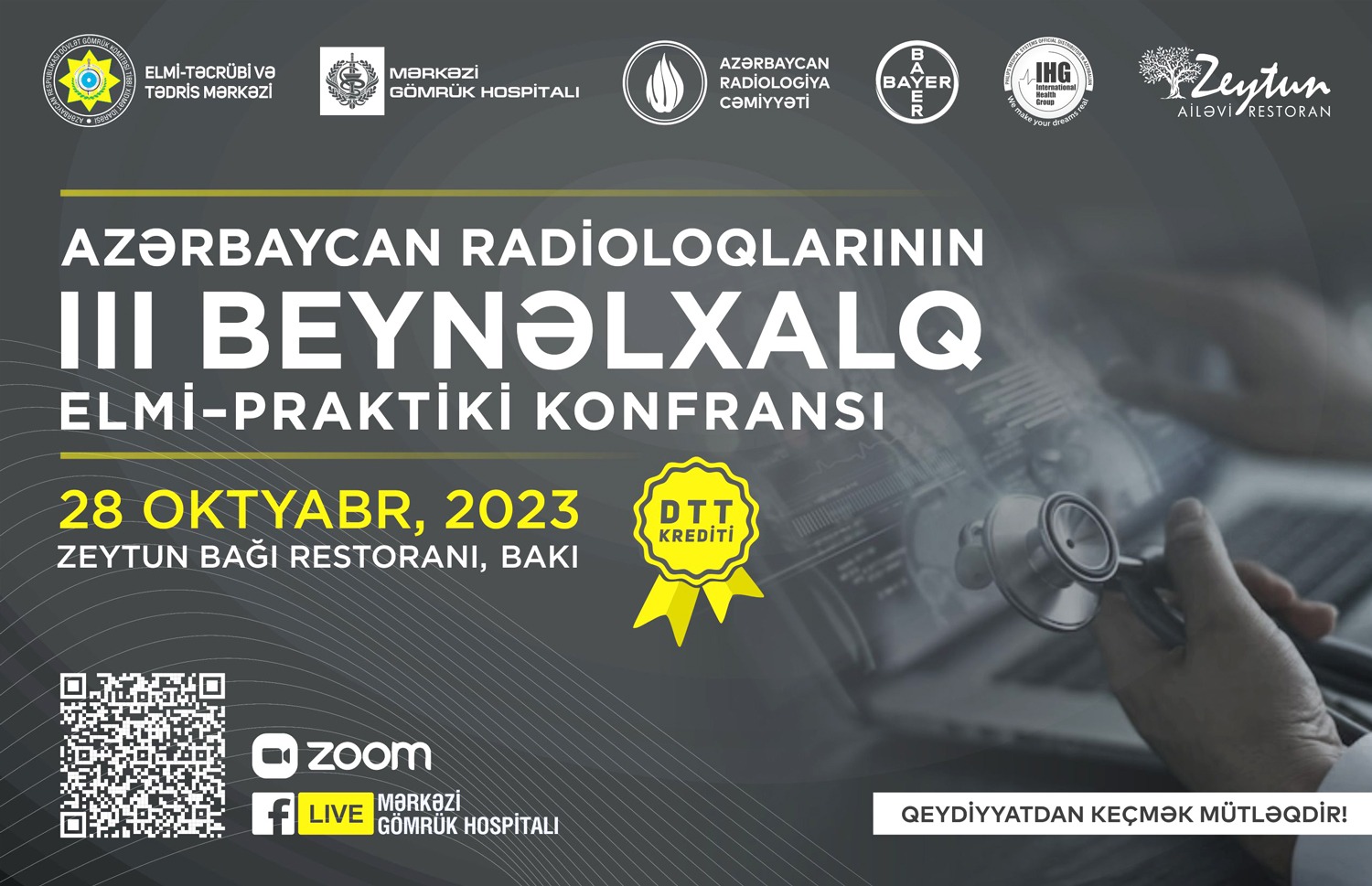 28 oktyabr 2023-ci il tarixində Dövlət Gömrük Komitəsinin Tibbi Xidmət İdarəsinin Elmi-Təcrübi və Tədris Mərkəzinin, Mərkəzi Gömrük Hospitalının və Azərbaycan Radioloqlar Cəmiyyətinin birgə təşkilatçılığı, eləcə də “Bayer” şirkətinin əməkdaşlığı ilə Azərbaycan Radioloqlarının III Beynəlxalq Elmi–Praktik Konfransı həyata keçiriləcək. SİA xəbər verir ki, konfransda Azərbaycan, Türkiyə, İngiltərə və Moskvadan olan ekspertlər tərəfindən müxtəlif xəstəliklər zamanı düzgün radioloji yanaşmanın vacibliyi barədə ümumilikdə 17 məruzənin dinlənilməsi planlaşdırılır. Konfrans zamanı mütəxəssislərin bilik və bacarıqlarının təkmilləşdirilməsi istiqamətində müzakirələrin və sual-cavab sesiyalarının təşkil olunması nəzərdə tutulur.