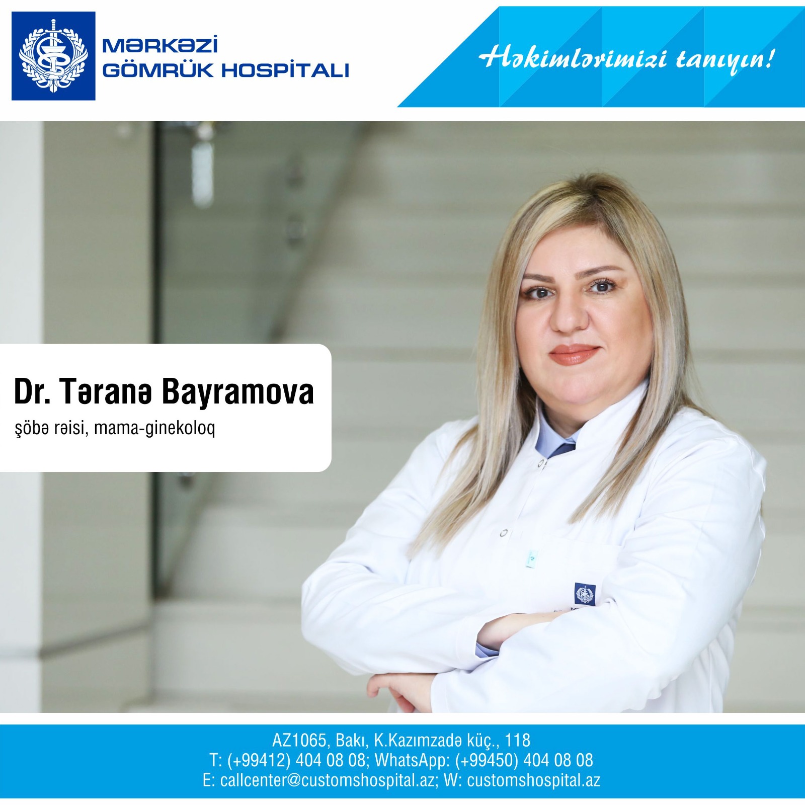 “Həkimlərimizi tanıyın!” rubrikamızda Sizlərə etibarlı, keyfiyyətli, peşəkar xidmət göstərən, yüzlərlə qadına ana sevinci bəxş edən yüksək ixtisaslı həkim, Mama-Ginekologiya şöbəsinin rəisi, t.ü.f.d., Gömrük Tibb Xidməti Polkovnik leytenantı, həkim mama-ginekoloq Təranə Bayramovanı təqdim edirik. SİA xəbər verir ki, dr.Təranə Bayramova Mərkəzi Gömrük Hospitalında normal, patoloji hamiləlik, orqan nəqli olmuş hamilələrin təqibi, normal fizioloji və cərrahi doğuşlar, konservativ və cərrahi ginekologiya, uroginekologiya, estetik cərrahiyyə (vaginoplastika, labioplastika) və kosmetik ginekologiya (PRP, dolğu, botox, kök hüceyrə nəqli), FEMİLİFT Lazer texnologiyası, Laparoskopik cərrahiyyə, sonsuzluğun konservativ və cərrahi müalicəsini həyata keçirir.