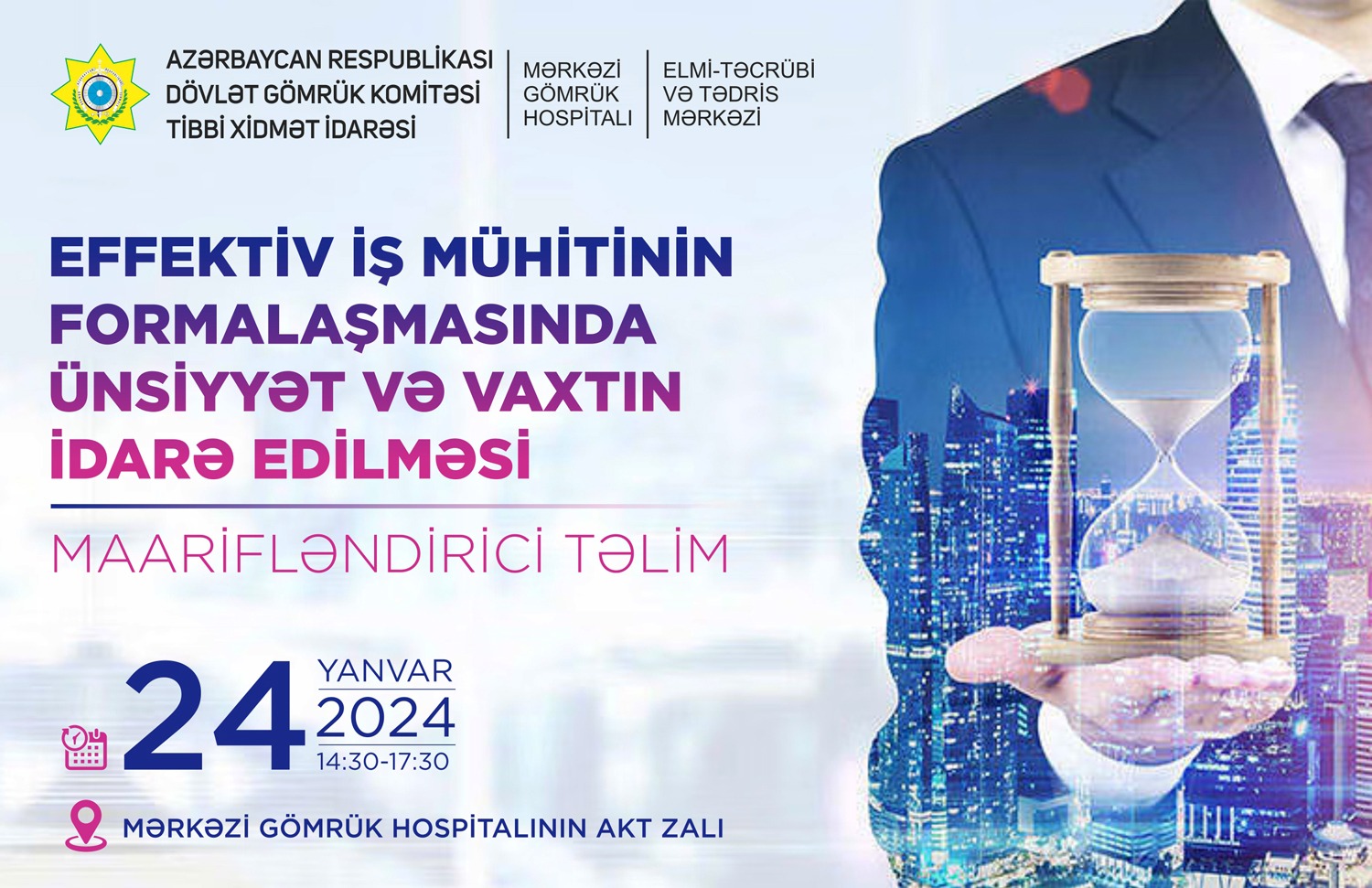 24 yanvar 2024-cü ildə Dövlət Gömrük Komitəsinin Tibbi Xidmət İdarəsinin Elmi-Təcrübi və Tədris Mərkəzinin təşkilatçılığı ilə “Effektiv iş mühitinin formalaşmasında ünsiyyət və vaxtın idarə edilməsinin əhəmiyyəti” mövzusunda maarifləndirici təlim keçiriləcəkdir.