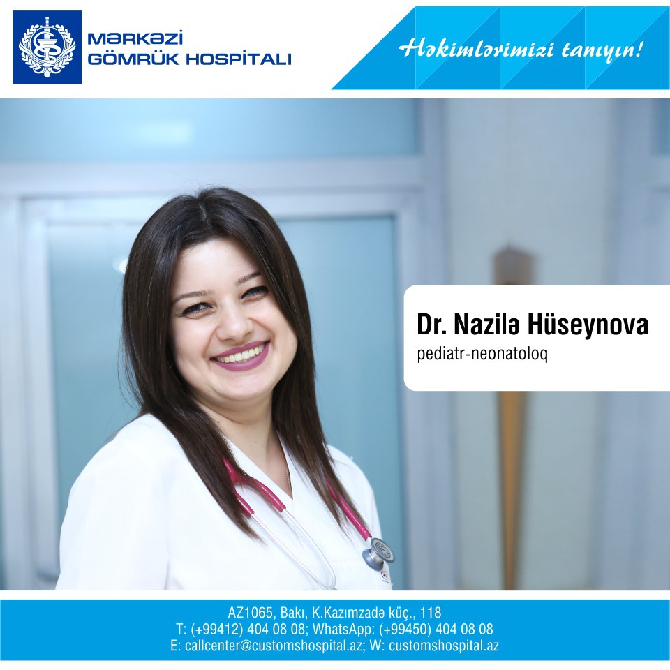 DR.NAZİLƏ HÜSEYNOVA Mərkəzi Gömrük Hospitalında yeni doğulmuş uşaqların müayinəsi, uşaqların anadan olduğu dövrdən 17 yaşa kimi olan dövrdə müayinə və müalicəsi, vaksinasiya, uşaqlarda qastroenterologiya, pulmonologiya, allerqologiya, otolarinqologiya kimi xəstəliklərin müalicəsi və ağır xəstələrin stasionar şəraitdə müalicəsi ilə məşğul olur. Həkim barədə daha ətraflı məlumat almaq üçün bu linkə daxil ola bilərsiniz: https://customshospital.az/nazile-huseynova/.