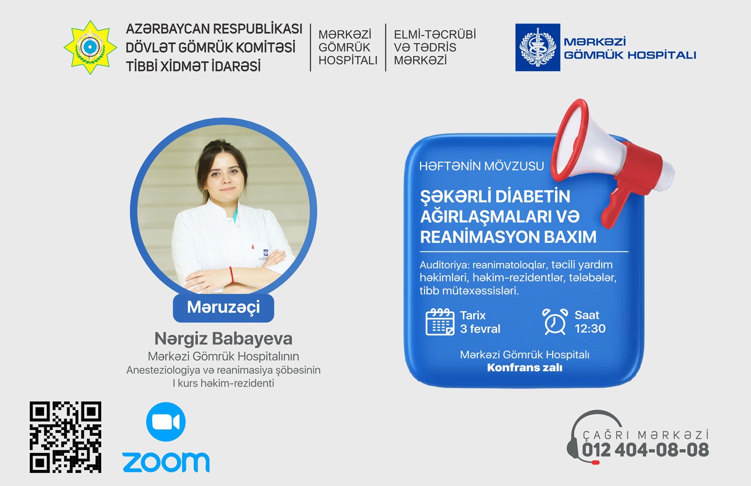 Mərkəzi Gömrük Hospitalının Anesteziologiya və reanimasiya şöbəsinin birinci kurs həkim-rezidenti Nərgiz Babayeva 3 fevral 2024-cü il tarixində saat 12.30-da “Şəkərli diabetin ağırlaşmaları və reanimasyon baxımı” çıxış edəcək. SİA xəbər verir ki, Mərkəzi Gömrük Hospitalının konfrans zalında əyani və zoom vasitəsilə gerçəkləşdiriləcək bu seminarda Mərkəzi Gömrük Hospitalının anestezioloq-reanimatoloqları, müxtəlif tibb müəssisələrində çalışan mütəxəssislər, təcili yardım həkimləri, anestezioloq-reanimatoloq ixtisası üzrə təhsil alan həkim-rezidentlər və tibb tələbələri iştiraka dəvətlidir.