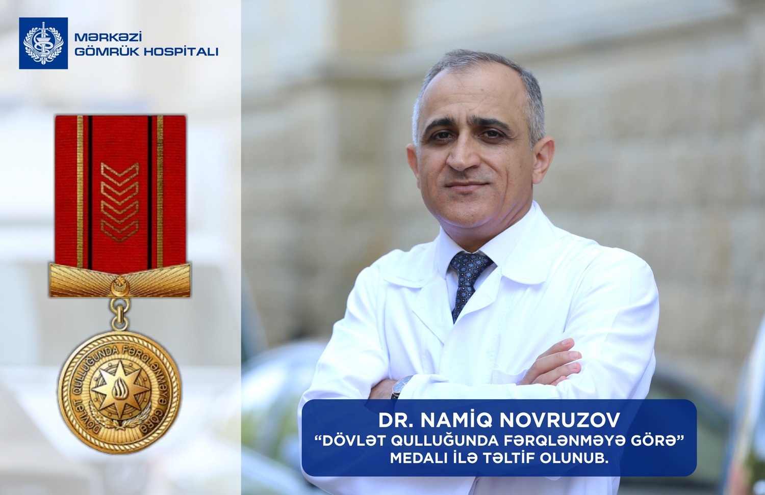 Azərbaycan Respublikası Prezidentinin sərəncamı ilə Azərbaycan Respublikası Dövlət Gömrük Komitəsinin Mərkəzi Hospitalının Ümumi Cərrahiyyə şöbəsinin rəisi, ümumi cərrah Namiq Novruzov Heydər oğlu Gömrük orqanlarında səmərəli fəaliyyətinə görə “Dövlət qulluğunda fərqlənməyə görə” medalı ilə təltif olunub. SİA xəbər verir ki, Dövlət Gömrük Komitəsi Tibbi Xidmət İdarəsinin və Mərkəzi Gömrük Hospitalının rəhbərliyi başda olmaqla bütün kollektiv Dr. Namiq Novruzovu bu münasibətlə təbrik edir, peşəkar fəaliyyətində yeni-yeni uğurlar arzulayır!
