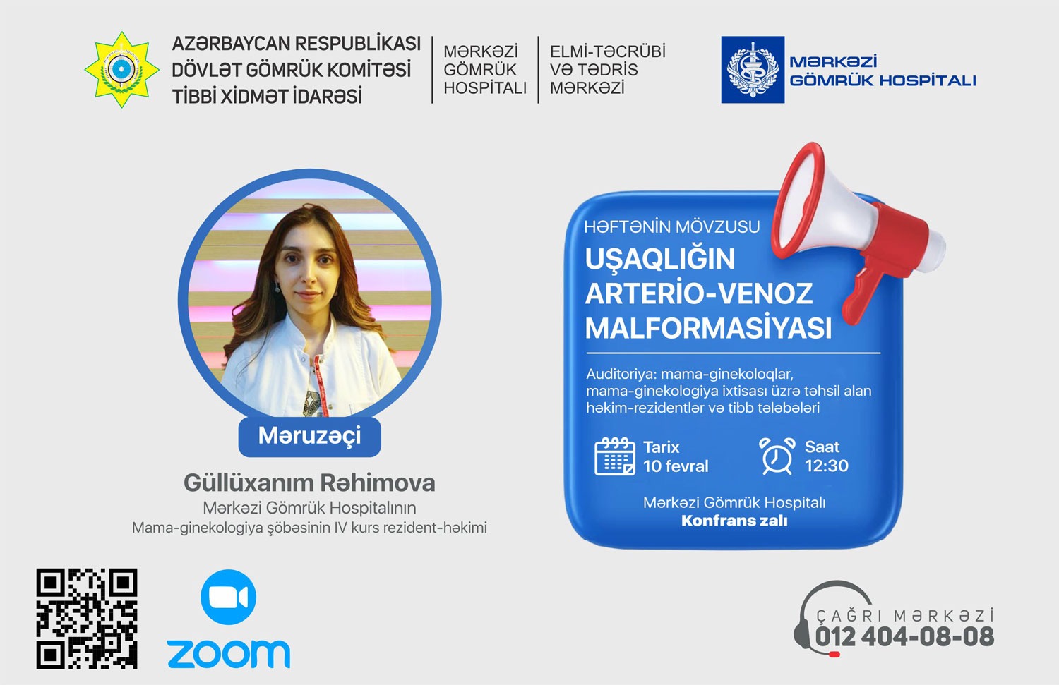 Mərkəzi Gömrük Hospitalının Mama-ginekologiya şöbəsinin IV kurs rezident-həkimi Güllüxanım Rəhimova 10 fevral 2024-cü il tarixində saat 12.30-da “Uşaqlığın arterio-venoz malformasiyası” mövzusunda təqdimatla çıxış edəcək. SİA xəbər verir ki, Mərkəzi Gömrük Hospitalının konfrans zalında əyani və zoom vasitəsilə gerçəkləşdiriləcək bu seminarda Mərkəzi Gömrük Hospitalının mama-ginekoloqları, mama-ginekologiya ixtisası üzrə təhsil alan həkim-rezidentlər və tibb tələbələri iştiraka dəvətlidir.