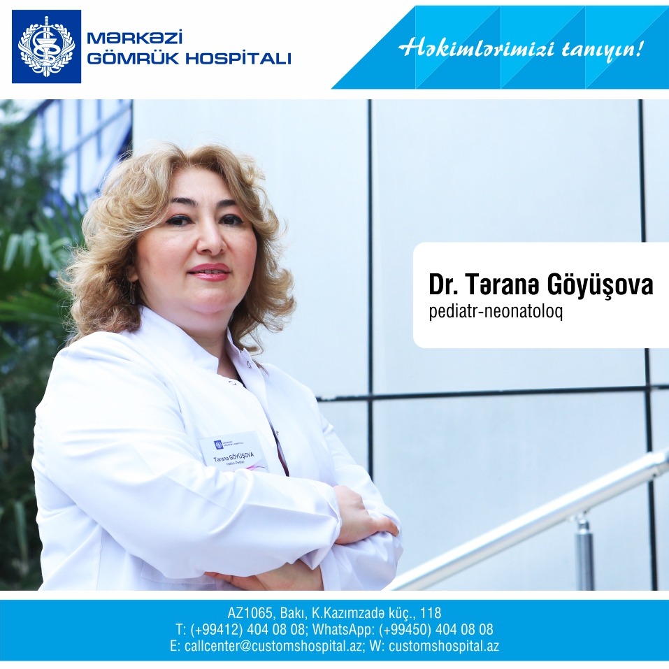 DR.TƏRANƏ GÖYÜŞOVA Mərkəzi Gömrük Hospitalının Pediatriya və Neonatologiya şöbəsində vaxtında və vaxtından əvvəl doğulmuş uşaqlara ilk reanimasiyon yardım və sonraki təqib, traxeya intubasiyası, mərkəzi damarların kateterizasiyası, usaqların ümumi müayinəsi, diaqnostikası və müalicəsini həyata keçirir. Həkim barədə daha ətraflı məlumat almaq üçün bu linkə daxil ola bilərsiniz: https://customshospital.az/tarana-goyshova/#