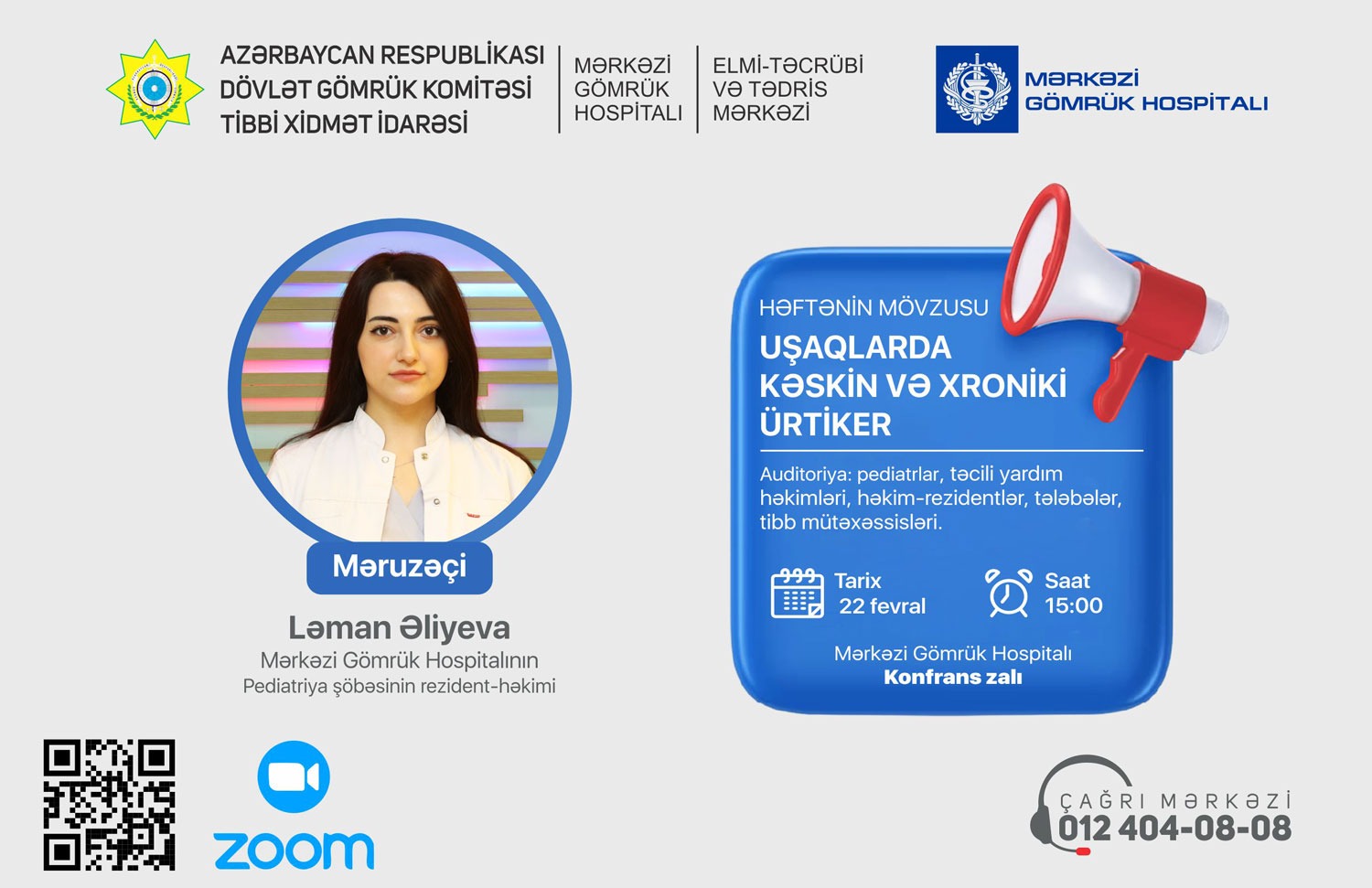 Mərkəzi Gömrük Hospitalının Pediatriya şöbəsinin rezident-həkimi Ləman Əliyeva 22 fevral tarixində saat 15.00-da “Uşaqlarda Kəskin və xroniki ürtiker” mövzusunda çıxış edəcək. SİA xəbər verir ki, Mərkəzi Gömrük Hospitalının konfrans zalında əyani və zoom vasitəsilə gerçəkləşdiriləcək bu seminarda Mərkəzi Gömrük Hospitalınınpediatrları, pediatriya ixtisası üzrə təhsil alan həkim-rezidentlər və tibb tələbələri iştiraka dəvətlidir. İştirak üçün aşağıdakı keçiddən qeydiyyata düşmək tələb olunur. Qeydiyyatdan keçən tibb mütəxəssislərinə telefon və ya e-mail vasitəsilə təsdiq məktubu göndəriləcək. Virtual qoşulmaq istəyənlər üçün isə Zoom link göndəriləcəkdir. Qeydiyyat üçün keçid: https://ref.az/tD2xfs.
