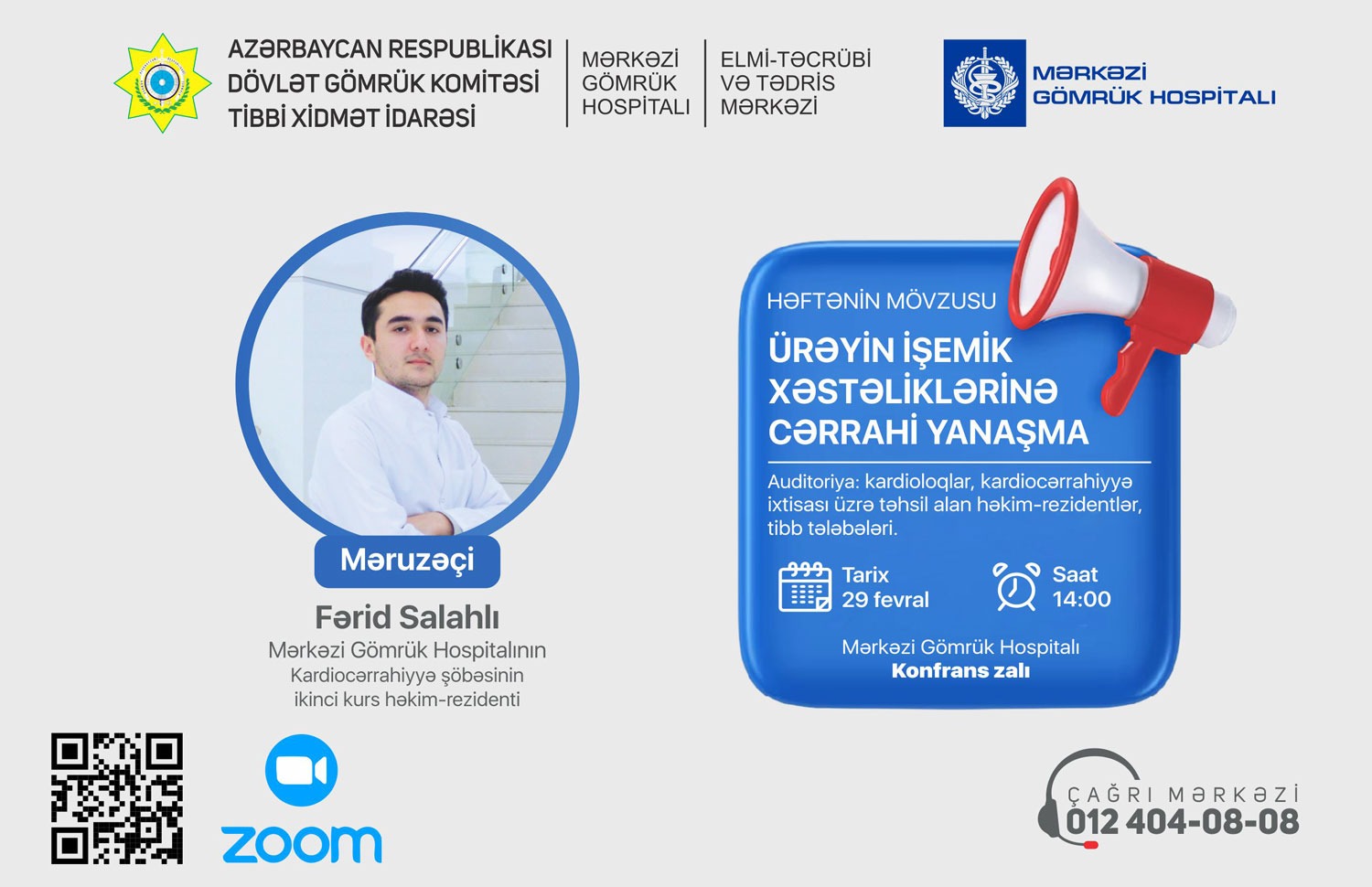 Mərkəzi Gömrük Hospitalının Kardiocərrahiyyə şöbəsinin ikinci kurs həkim-rezidenti Fərid Salahlı 29 fevral 2024-cü il tarixində saat 14.00-da “Ürəyin işemik xəstəliklərinə cərrahi yanaşma” mövzusunda təqdimatla çıxış edəcək. SİA xəbər verir ki, Mərkəzi Gömrük Hospitalının konfrans zalında əyani və zoom vasitəsilə gerçəkləşdiriləcək bu seminarda Mərkəzi Gömrük Hospitalının kardioloqları, kardiocərrahiyyə ixtisası üzrə təhsil alan həkim-rezidentlər və tibb tələbələri iştiraka dəvətlidir. İştirak üçün aşağıdakı keçiddən qeydiyyata düşmək tələb olunur. Qeydiyyatdan keçən tibb mütəxəssislərinə telefon və ya e-mail vasitəsilə təsdiq məktubu göndəriləcək. Virtual qoşulmaq istəyənlər üçün isə Zoom link göndəriləcəkdir. Qeydiyyat üçün keçid: https://ref.az/tD2xfs.