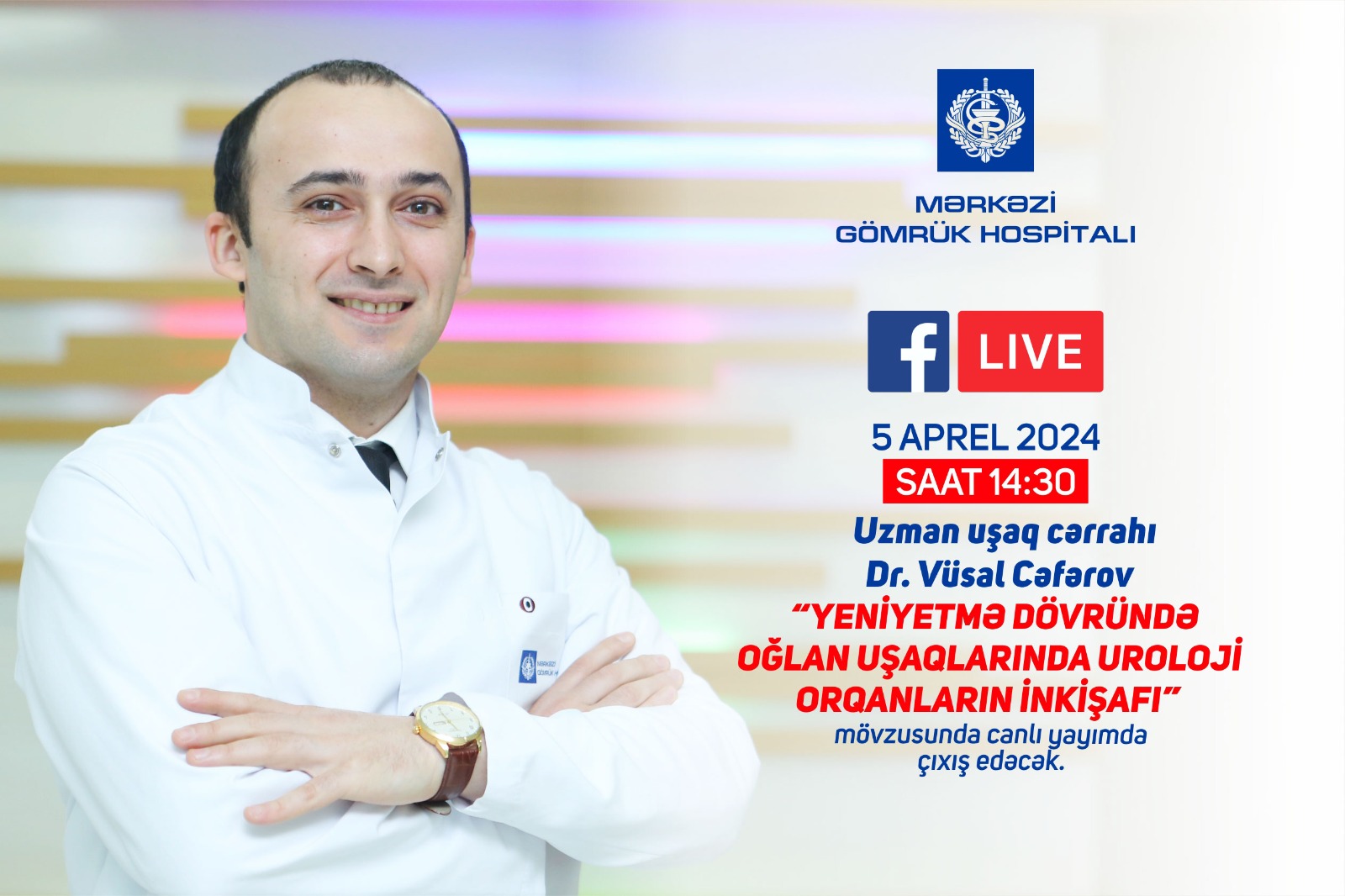 Mərkəzi Gömrük Hospitalının Uşaq Cərrahiyyəsi şöbəsinin rəisi, uzman uşaq cərrahı Vüsal Cəfərov 5 aprel 2024-cü il tarixində saat 14.30-da “Yeniyetmə dövründə oğlan uşaqlarında uroloji orqanların inkişafı” mövzusunda canlı yayımda çıxış edəcək və izləyicilərin suallarını cavablandıracaq. SİA xəbər verir ki, canlı yayım Mərkəzi Gömrük Hospitalının rəsmi Facebook səhifəsi üzərindən yayımlanacaq (https://www.facebook.com/customshospital/).