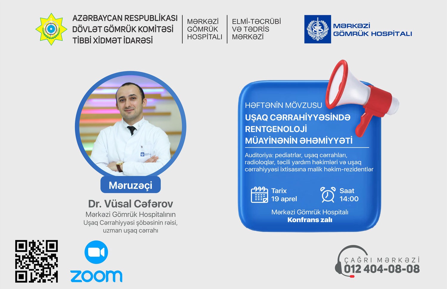 Mərkəzi Gömrük Hospitalının Uşaq Cərrahiyyəsi şöbəsinin rəisi, uzman uşaq cərrahı Vüsal Cəfərov 19 aprel 2024-cü il tarixində saat 14.00-da “Uşaq cərrahiyyəsində rentgenoloji müayinənin əhəmiyyəti” mövzusunda təqdimatla çıxış edəcək. SİA xəbər verir ki, seminar pediatrlar, uşaq cərrahları, radioloqlar, təcili yardım həkimləri və uşaq cərrahiyyəsi ixtisasına malik həkim-rezidentlər üçün nəzərdə tutulub. Tədbirdə əyani və virtual iştirak etmək mümkündür. Qeydiyyatdan keçərək virtual qoşulmaq istəyən tibb mütəxəssislərinə Zoom link göndəriləcəkdir. Qeydiyyat üçün keçid: https://ref.az/Np5nrN. Uşaq Cərrahiyyəsi şöbəsinin rəisi, uzman uşaq cərrahı Vüsal Cəfərov Dr. Vüsal Cəfərov 2009-cu ildə Azərbaycan Tibb Universitetinin pediatriya fakültəsini bitirdikdən sonra 2011-2016-cı illərdə İstanbul Cərrahpaşa Universitetinin Tibb fakültəsinin Uşaq Cərrahiyyəsi və Uşaq Urologiyası bölməsində uzmanlıq təhsili almışdır. Vüsal həkimin uşaq cərrahiyyəsi sahəsində apardığı əməliyyatların sayı 5000-i ötmüşdür.