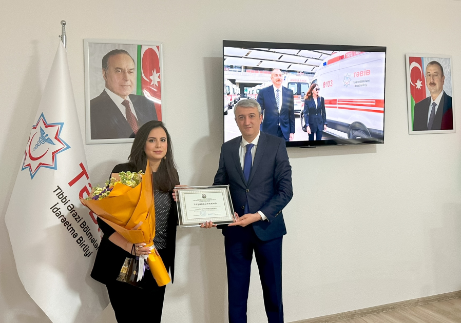Bu gün TƏBİB-in İcraçı direktoru Vüqar Qurbanov həmin əməkdaşları - Respublika Təcili və Təxirəsalınmaz Tibbi Yardım Mərkəzinin təcili və təxirəsalınmaz tibbi yardım həkimi Nərmin Pənahovanı, feldşer Xatunə İbrahimovanı, sürücü Aftandil Əhmədovu, İsmayıllı Rayon Mərkəzi Xəstəxanasının Təcili və təxirəsalınmaz tibbi yardım stansiyasının mama-ginekoloqu Afaq Mirzəyevanı, mama İlahə Adgözəlovanı, feldşer Ramin Şıxaliyevi və sürücü Gülağa Abdullayevi təcili tibbi yardım xidmətinin nümunəvi və səmərəli təşkilinə görə təltif edib.