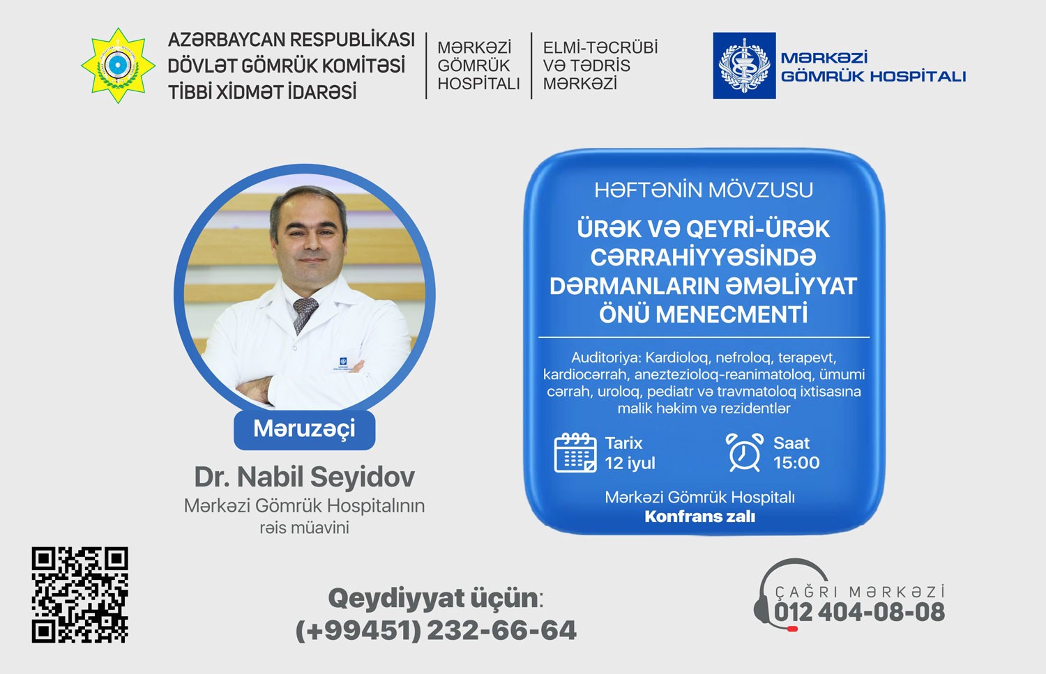 12 iyul 2024-cü il tarixində saat 15:00-da Dövlət Gömrük Komitəsinin Tibbi Xidmət İdarəsinin Elmi-Təcrübi və Tədris Mərkəzinin təşkilatçılığı ilə Mərkəzi Gömrük Hospitalında “Ürək və qeyri-ürək cərrahiyyəsində dərmanların əməliyyat önü menecmenti” mövzusunda seminar keçiriləcək. SİA xəbər verir ki, seminarda Mərkəzi Gömrük Hospitalının rəis müavini, tibb xidməti mayoru, kardioloq Nabil Seyidov geniş təqdimatla çıxış edəcək və auditoriyanı maraqlandıran sualları cavablandıracaq.