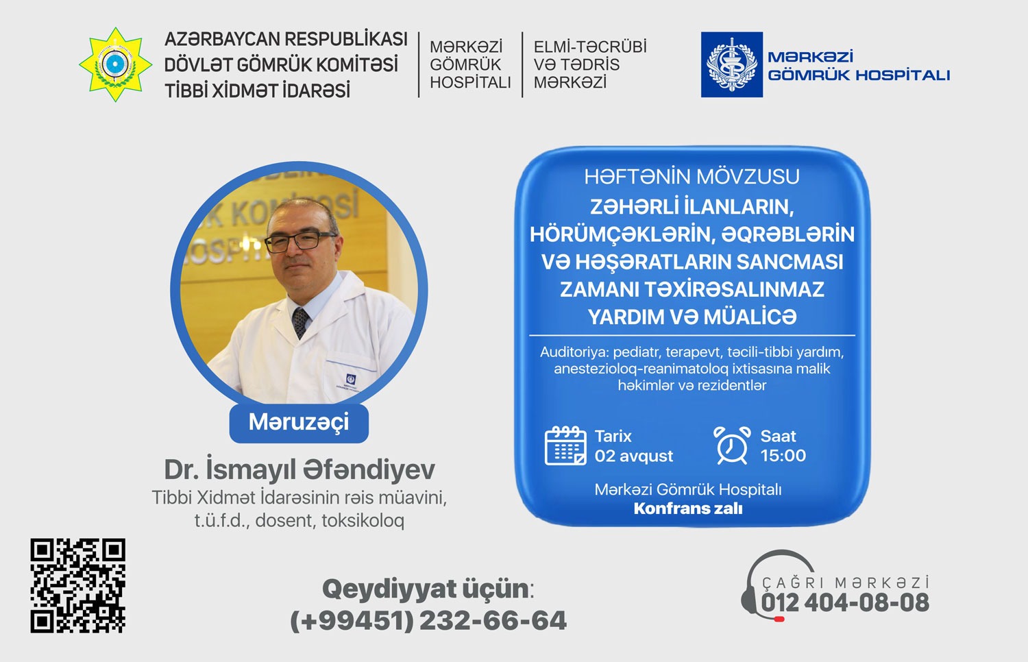 Seminarda Mərkəzi Gömrük Hospitalının Tibbi Xidmət İdarəsinin rəis müavini, t.ü.f.d., dosent, toksikoloq İsmayıl Əfəndiyev geniş təqdimatla çıxış edəcək və auditoriyanı maraqlandıran sualları cavablandıracaq.