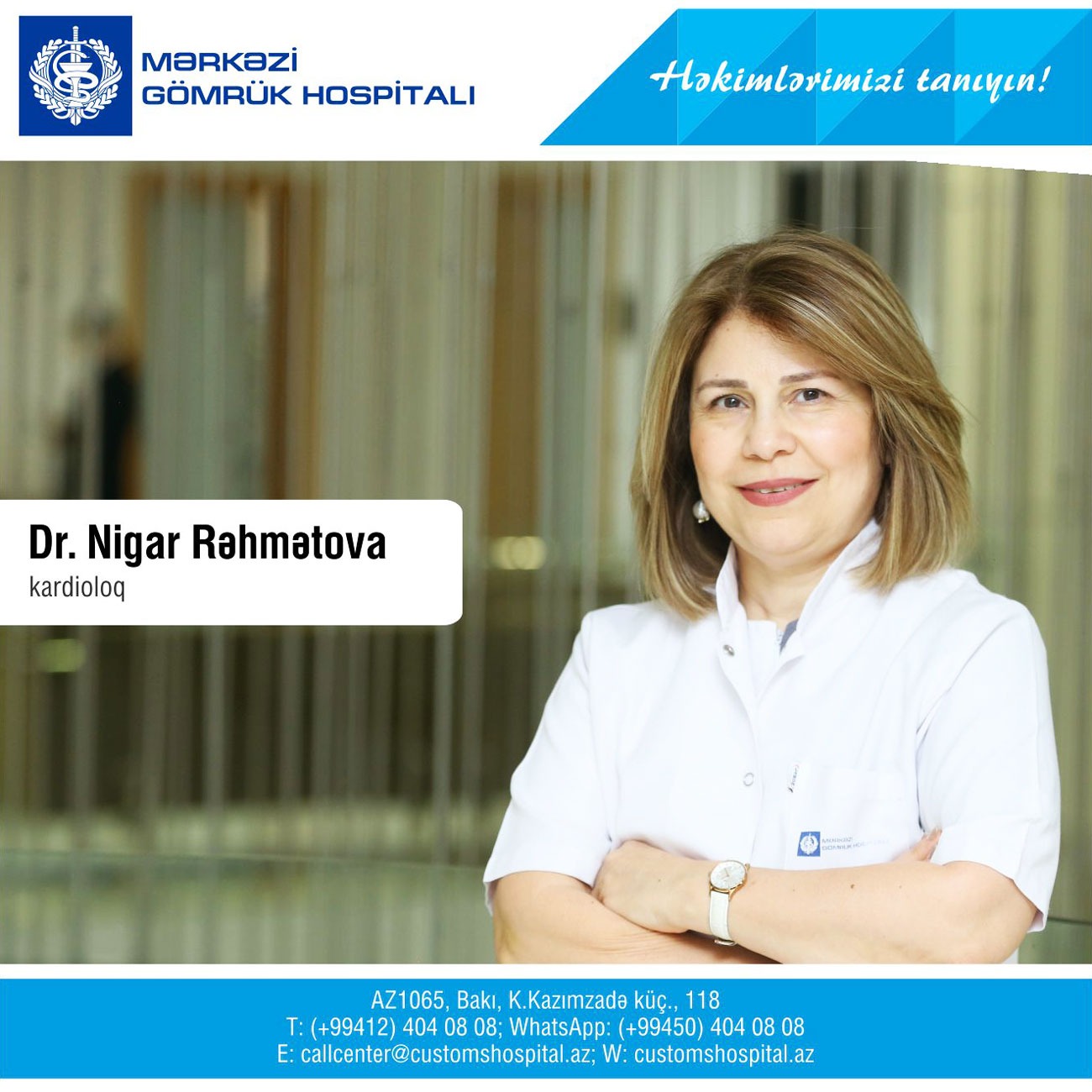 Kardiologiya şöbəsinin zəngin iş təcrübəsinə malik peşəkar həkim-kardioloqu Nigar Rəhmətovanı təqdim edirik. Dr.Nigar Rəhmətova Mərkəzi Gömrük Hospitalında elektrokardioqramma, fasiləsiz EKQ holter monitorinqi, fasiləsiz, transezofaqeal exokardioqrafiya, kardiovaskulyar stress test - treadmill, tilt table testı, stress exokardioqrafiya prosedurları həyata keçirir. Həkim barədə daha ətraflı məlumat almaq üçün bu linkə daxil ola bilərsiniz: https://customshospital.az/nigar-rehmetova