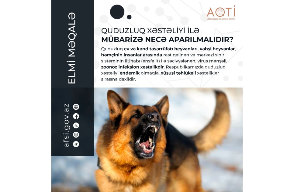Quduzluq ev və kənd təsərrüfatı heyvanları, vəhşi heyvanlar, həmçinin insanlar arasında rast gəlinən və mərkəzi sinir sisteminin iltihabı (ensefalit) ilə səciyyələnən, virus mənşəli, zoonoz infeksion xəstəlikdir. Respublikamızda quduzluq xəstəliyi endemik olmaqla, xüsusi təhlükəli xəstəliklər sırasına daxildir. Ümumdünya Səhiyyə Təşkilatının (ÜST) məlumatına görə, quduzluq virusu əsasən Asiya və Afrika ölkələri olmaqla, dünyada hər il 50 mindən çox insanın ölümünə səbəb olur. Son zamanlar isə dünyada baş verən iqlim dəyişiklikləri, biomüxtəliflik və ekoloji balansın pozulması səbəbindən vəhşi heyvanlar arasında miqrasiya genişlənib və yeni xəstəlik ocaqlarının yaranması riski xeyli artıb. Azərbaycan Qida Təhlükəsizliyi Agentliyindən SİA-ya verilən məlumata görə, quduzluq xəstəliyinin törədicisi olan “Rabies” virusu taksonomik olaraq “Mononegavirales” sırasının “Rhabdoviridae” ailəsinə və “Lyssavirus” cinsinə mənsubdur. Törədici mənşə etibarilə RNT tərkibli olmaqla, neyrotrop (sinir toxumasına sirayət etməyə meyilli) xüsusiyyətlidir. Virus xəstə heyvanların ağız suyu ilə ifraz edildiyindən, xəstəlik daha çox quduz heyvanların dişləməsi nəticəsində baş verir. Xəstəlik törədicisinin əsas mənbəyi xəstə ev heyvanları və vəhşi heyvanlar hesab olunur. İnsanlar arasında yoluxma, əsasən, xəstə ev heyvanlarının, xüsusilə itlərin dişləməsi ilə baş versə də, zədələnmiş dəri və selikli qişaların xəstə heyvanların ağız suyu ilə təması da yoluxmaya səbəb olur.