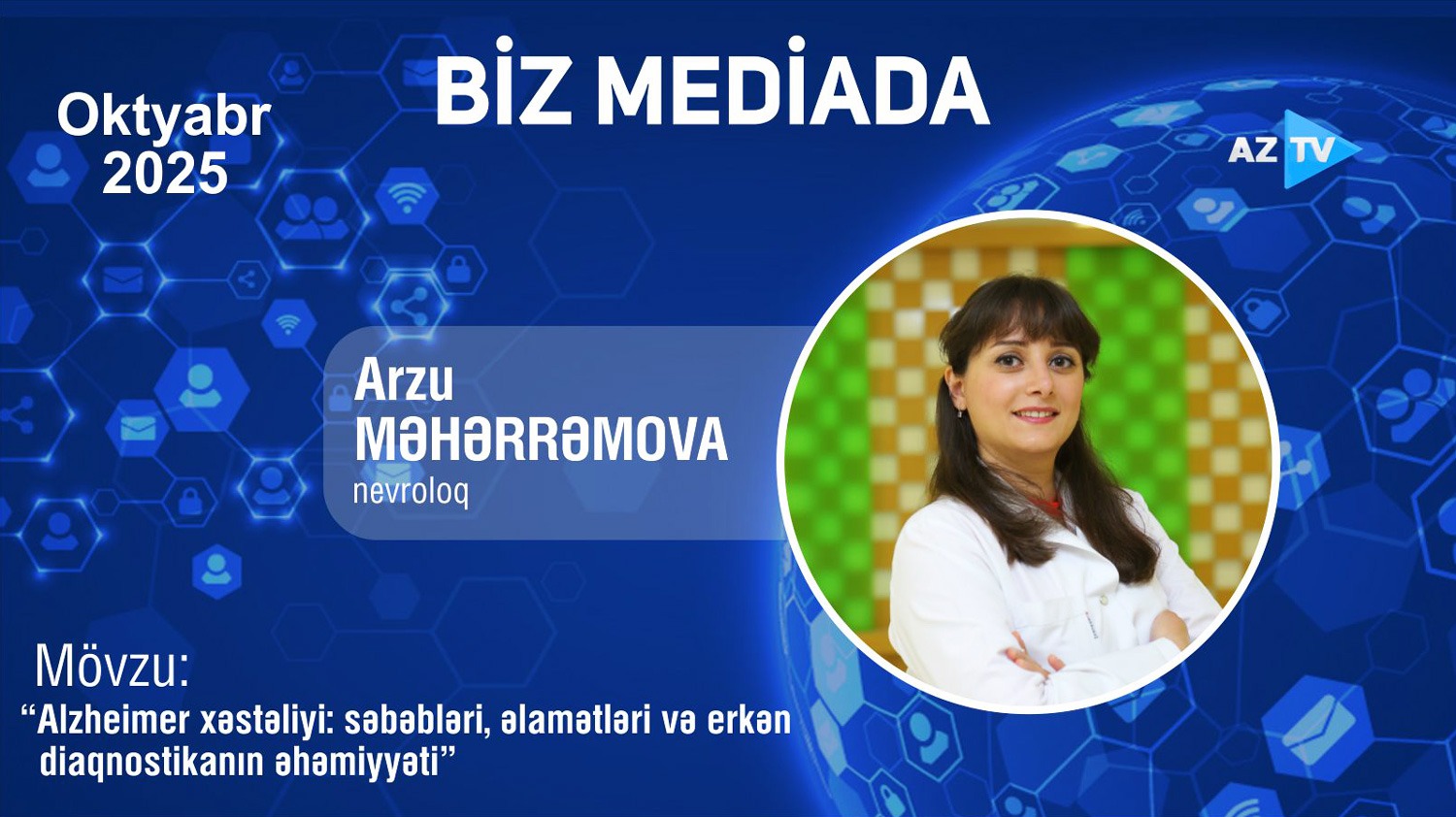 Mərkəzi Gömrük Hospitalının yüksəkixtisaslı uzman nevroloqu Dr.Arzu Məhərrəmova AZTV-nin “Telesəhər” proqramına “Alzheimer xəstəliyi: səbəbləri, əlamətləri və erkən diaqnostikanın əhəmiyyəti” mövzusunda ətraflı məlumat verib. SİA videonu sizə təqdim edir: