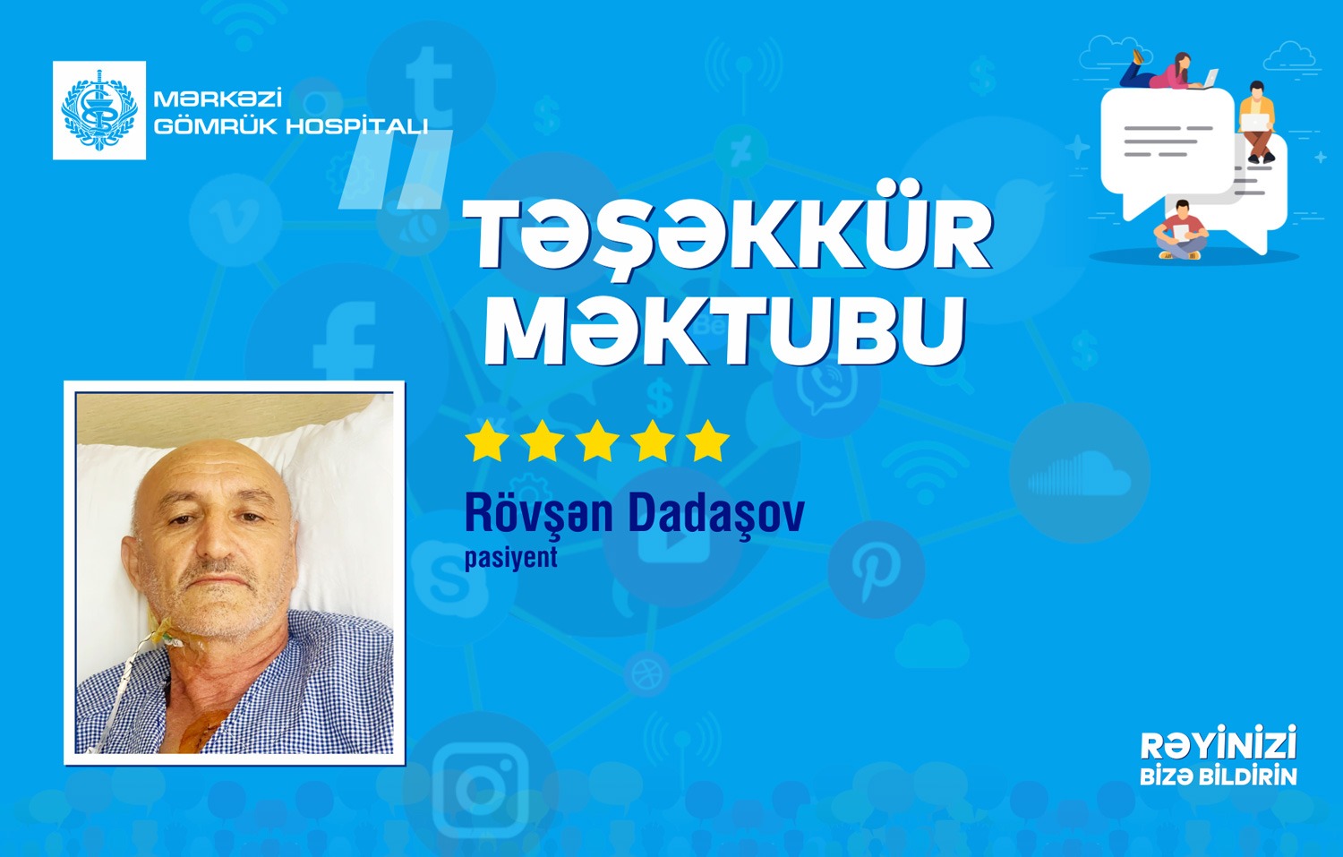 Mərkəzi Gömrük Hospitalının Ürək-Damar Cərrahiyyəsi şöbəsinin rəisi, uzman ürək-damar cərrahı Dr. Elməddin Əliyev tərəfindən uğurla əməliyyat olunan pasiyent Rövşən Dadaşov ona göstərilən diqqət və qayğıya görə dərin minnətdarlığını bildirib.