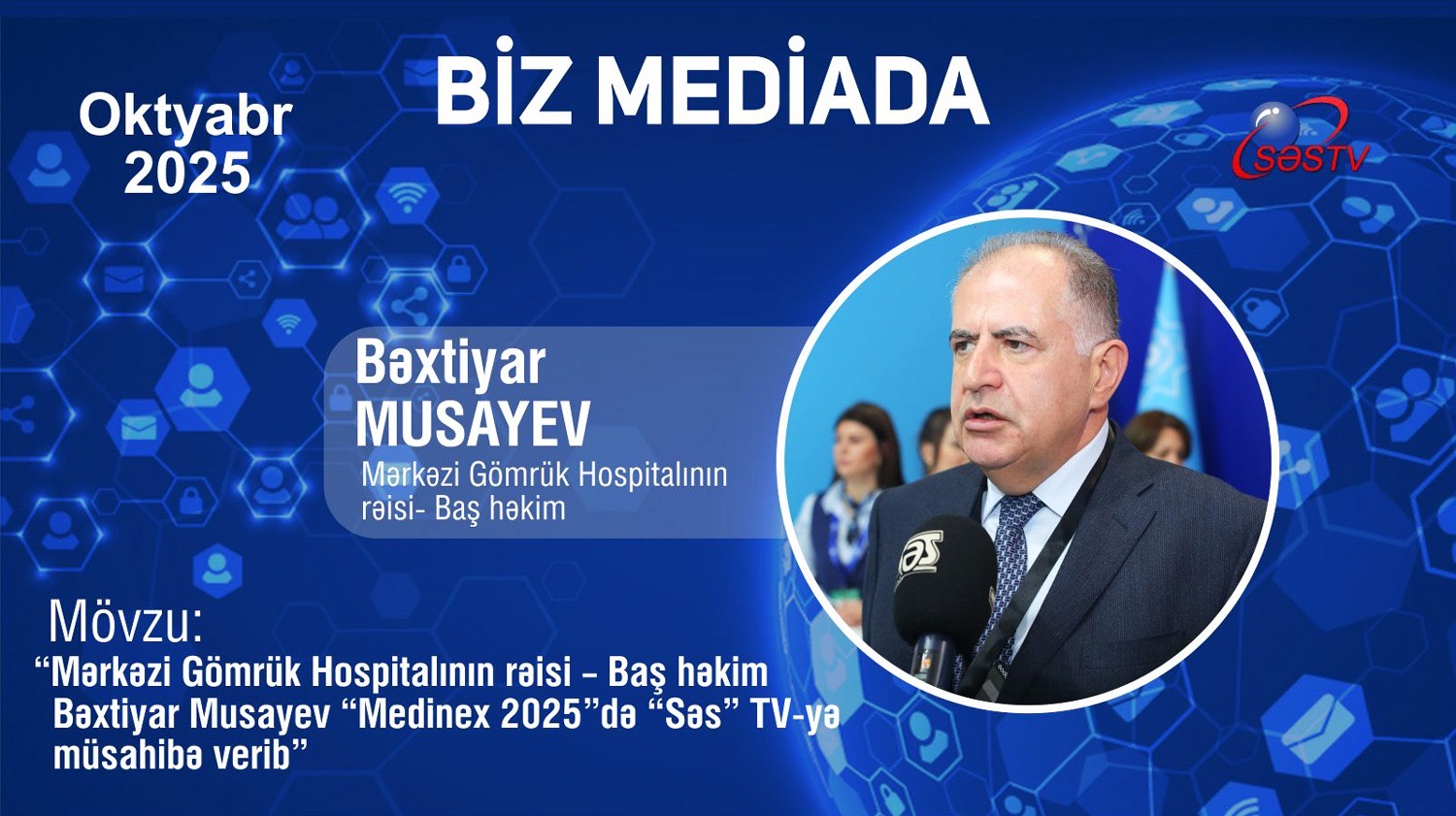 Mərkəzi Gömrük Hospitalının Baş həkimi Bəxtiyar Musayev “Medinex 2025”-də SƏS TV-yə müsahibə verib. SİA xəbər verir ki, Mərkəzi Gömrük Hospitalının rəisi - Baş həkim Bəxtiyar Musayev Baku Expo Mərkəzində keçirilən 27-ci Azərbaycan Beynəlxalq Tibb İnnovasiyaları Sərgisi “Medinex 2025”-də Hospitalın 2025-ci ildəki fəaliyyət istiqamətləri, həyata keçirilən yeniliklər, əldə olunan mühüm nailiyyətlər və innovativ tibbi xidmətlər barədə SƏS TV-yə müsahibə verib.