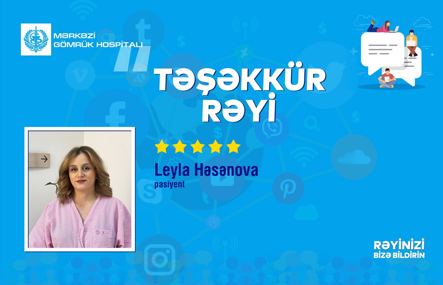 Hər birinizin səmimi münasibəti, peşəkarlığı və dəstəyi sayəsində doğuş prosesim çox rahat və etibarlı keçdi. Mərkəzi Gömrük Hospitalını bütün gələcək analara ürəkdən tövsiyə edirəm!”