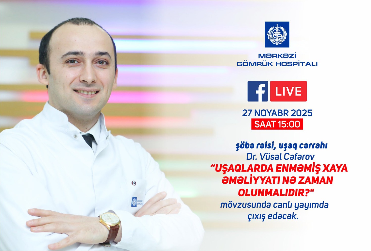 Mərkəzi Gömrük Hospitalının Uşaq cərrahiyyəsi şöbəsinin rəisi, yüksəkixtisaslı uzman uşaq cərrahı Vüsal Cəfərov 27 noyabr 2025-ci il tarixində saat 15.00-da “Uşaqlarda enməmiş xaya əməliyyatı nə zaman olunmalıdır?” mövzusunda canlı yayımda çıxış edəcək və izləyicilərin suallarını cavablandıracaq. Canlı yayım Mərkəzi Gömrük Hospitalının rəsmi Facebook səhifəsi üzərindən yayımlanacaq (https://www.facebook.com/customshospital/). Sualları canlı yayım vaxtı və yaxud öncədən Mərkəzi Gömrük Hospitalının facebook səhifəsi vasitəsilə ünvanlamaq mümkündür. Dr. Vüsal Cəfərov 2009-cu ildə Azərbaycan Tibb Universitetinin pediatriya fakültəsini bitirdikdən sonra 2011-2016-cı illərdə İstanbul Cərrahpaşa Universitetinin Tibb fakültəsinin Uşaq Cərrahiyyəsi və Uşaq Urologiyası bölməsində uzmanlıq təhsili almışdır.Dr. Vüsal Cəfərov 2016-cı ildən etibarən Mərkəzi Gömrük Hospitalında uşaq cərrahı kimi çalışır. O, uşaqlarda anadangəlmə inkişaf qüsurlarının, yenidoğulmuş uşaqların cərrahi problemlərinin, uşaqlarda rast gəlinən təcili patologiyaların müalicəsi üçün aparılan əməliyyatları, həmçinin, müxtəlif növ uşaq uroloji əməliyyatlarını həm açıq cərrahiyyə, həm də laparoskopik üsulla icra edir.O, dünya mətbuatını mütəmadi olaraq izləyir, tibb elminin nailiyyətləri ilə tanış olur, onları öyrənir və öz təcrübəsində tətbiq edir. Dr.Vüsal Cəfərovun “Xayanın xayalıqdan kənar yerləşməsi” elmi məqaləsi 12 oktyabr 2019-cu il tarixində “Elsevier” nəşriyyat evinə daxil olan nüfuzlu “Journal of Pediatric Surgery Case Report” jurnalının online versiyasında ingilis dilində işıqlanıb. Dr. Vüsal Cəfərov Türk Təbiblər Birliyinin, Türk Uşaq Cərrahiyyəsi Dərnəyinin, Türk Hipospadiya Dərnəyinin üzvüdür. Həkim barədə daha ətraflı məlumat almaq üçün bu linkə daxil ola bilərsiniz: https://customshospital.az/vusal-ceferov/