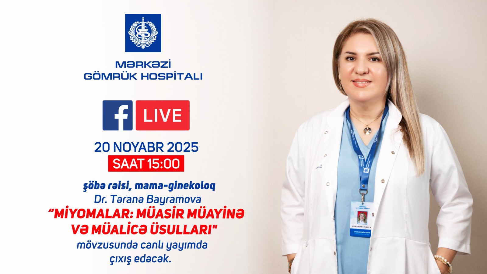 Mərkəzi Gömrük Hospitalının Mamalıq-ginekologiya şöbəsinin rəisi, tibb üzrə fəlsəfə doktoru və mama-ginekoloq Təranə Bayramova 20 noyabr 2025-ci il tarixində saat 15:00-da “Miomalar: müasir müayinə və müalicə üsulları” mövzusunda canlı yayım çıxışı edib.