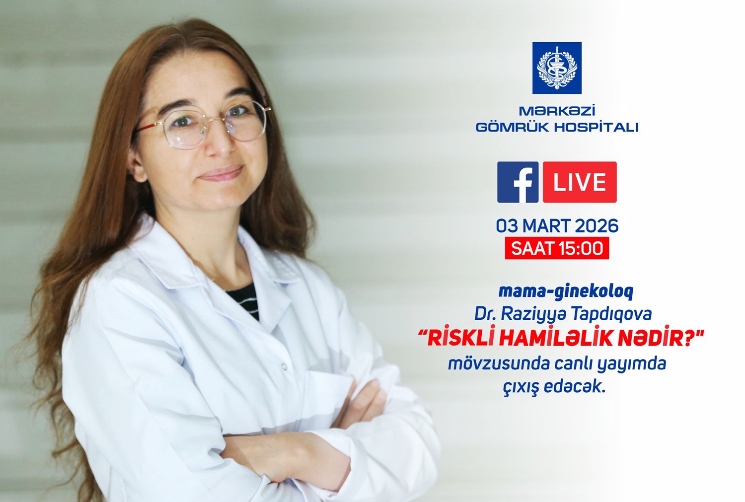 Mərkəzi Gömrük Hospitalının Mama-ginekologiya şöbəsinin yüksəkixtisaslı mama-ginekoloqu Raziyyə Tapdıqova 3 mart 2026-cı il tarixində saat 15.00-da canlı yayımda “Riskli hamiləlik nədir?” mövzusunda çıxış edəcək və izləyicilərin suallarını cavablandıracaq. Canlı yayım Mərkəzi Gömrük Hospitalının rəsmi Facebook səhifəsi üzərindən yayımlanacaq. Sualları canlı yayım vaxtı və yaxud öncədən Mərkəzi Gömrük Hospitalının facebook səhifəsi vasitəsilə ünvanlamaq mümkündür. (https://www.facebook.com/customshospital/).