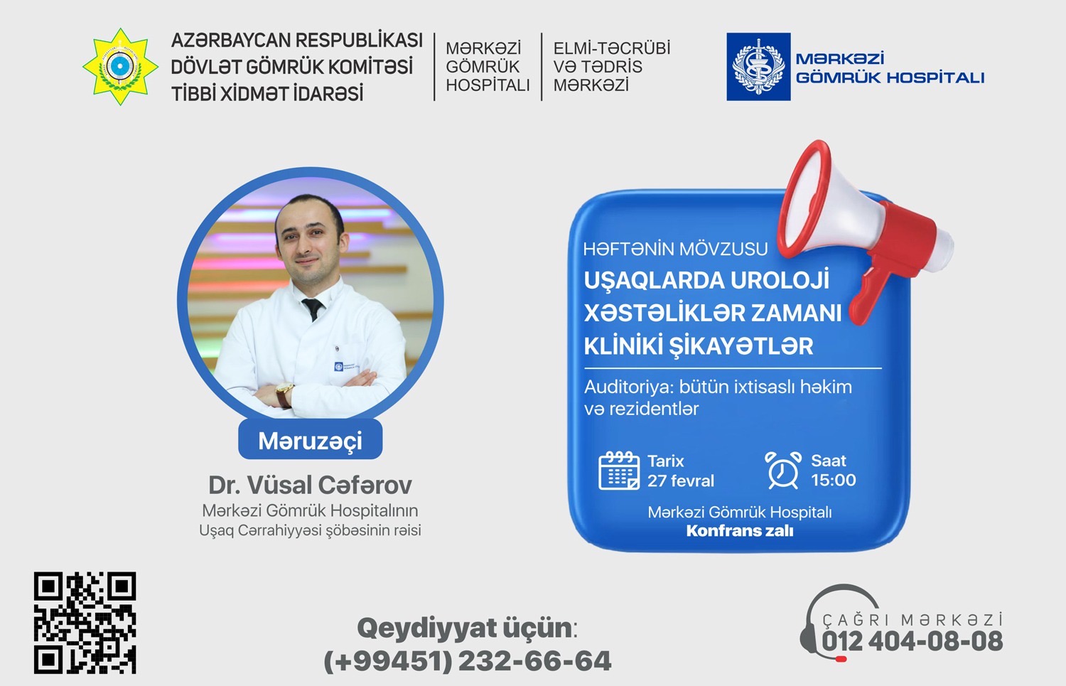 27 fevral 2026-cı il tarixində Dövlət Gömrük Komitəsinin Tibbi Xidmət İdarəsinin Elmi-Təcrübi və Tədris Mərkəzinin təşkilatçılığı ilə Mərkəzi Gömrük Hospitalında saat 15:00-da “Uşaqlarda uroloji xəstəliklər zamanı kliniki şikayətlər” mövzusunda seminar həyata keçiriləcəkdir.