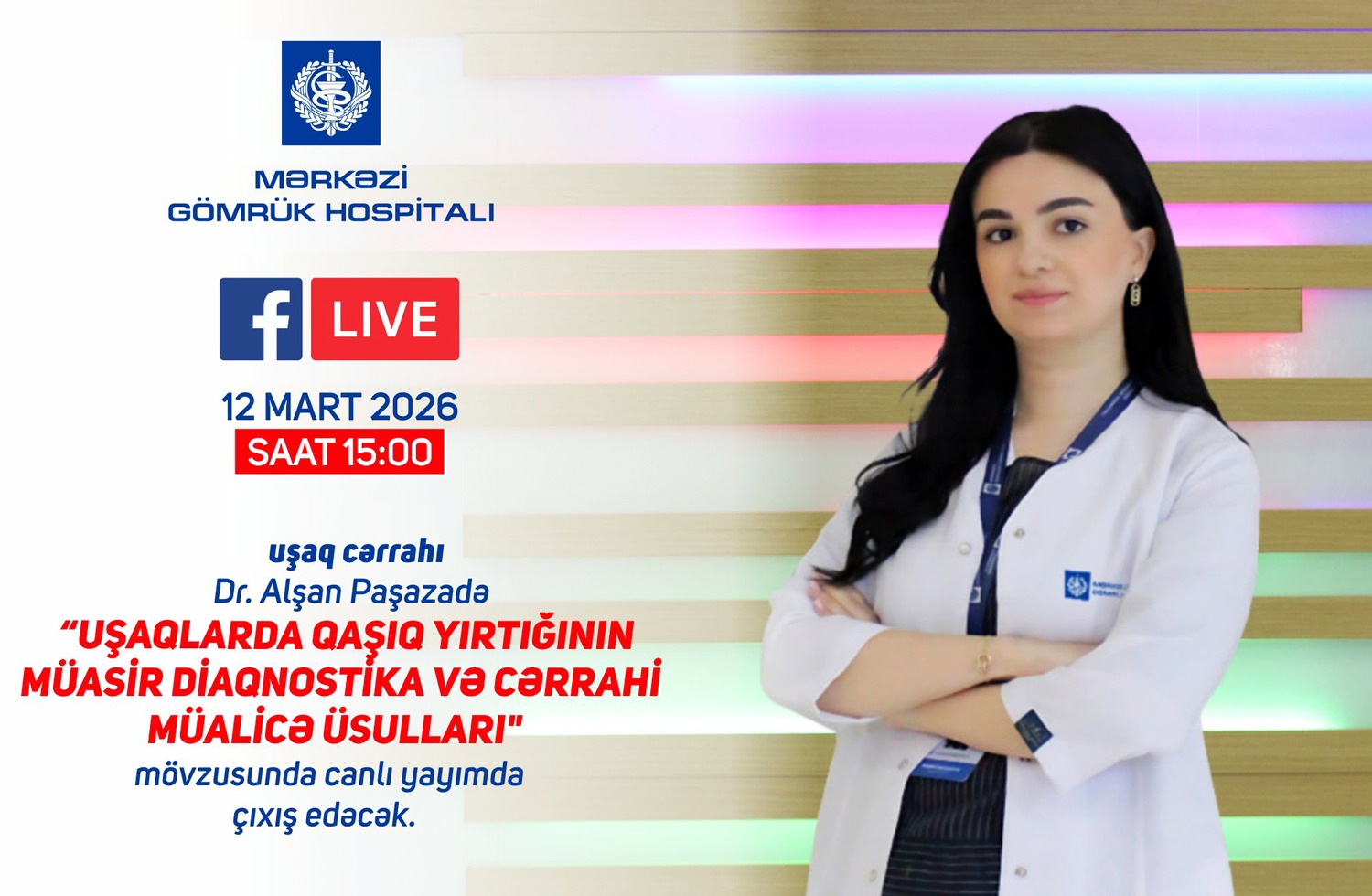 Mərkəzi Gömrük Hospitalının Uşaq Cərrahiyyəsi şöbəsinin uşaq cərrahı Dr. Alşan Paşazadə 12 mart 2026-cı il tarixində saat 15.00-da “Uşaqlarda qaşıq yırtığının müasir diaqnostika və cərrahi müalicə üsulları” mövzusunda canlı yayımda çıxış edəcək. Canlı yayım Mərkəzi Gömrük Hospitalının rəsmi Facebook səhifəsi üzərindən yayımlanacaq. https://www.facebook.com/customshospital/. Sualları canlı yayım vaxtı və yaxud öncədən də ünvanlaya bilərsiniz!