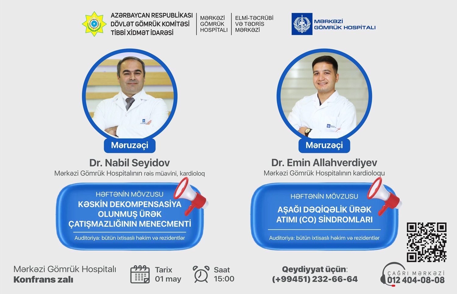 Seminarda Mərkəzi Gömrük Hospitalının rəis müavini, kardioloq Nabil Seyidov “Kəskin dekompensasiya olunmuş Ürək Çatışmazlığının menecmenti” və Kardiologiya şöbəsinin kardioloqu Emin Allahverdiyev “Aşağı dəqiqəlik ürək atımı (CO) sindromları” mövzularında geniş təqdimatla çıxış edəcək, həmçinin auditoriyanı maraqlandıran sualları cavablandıracaqlar.