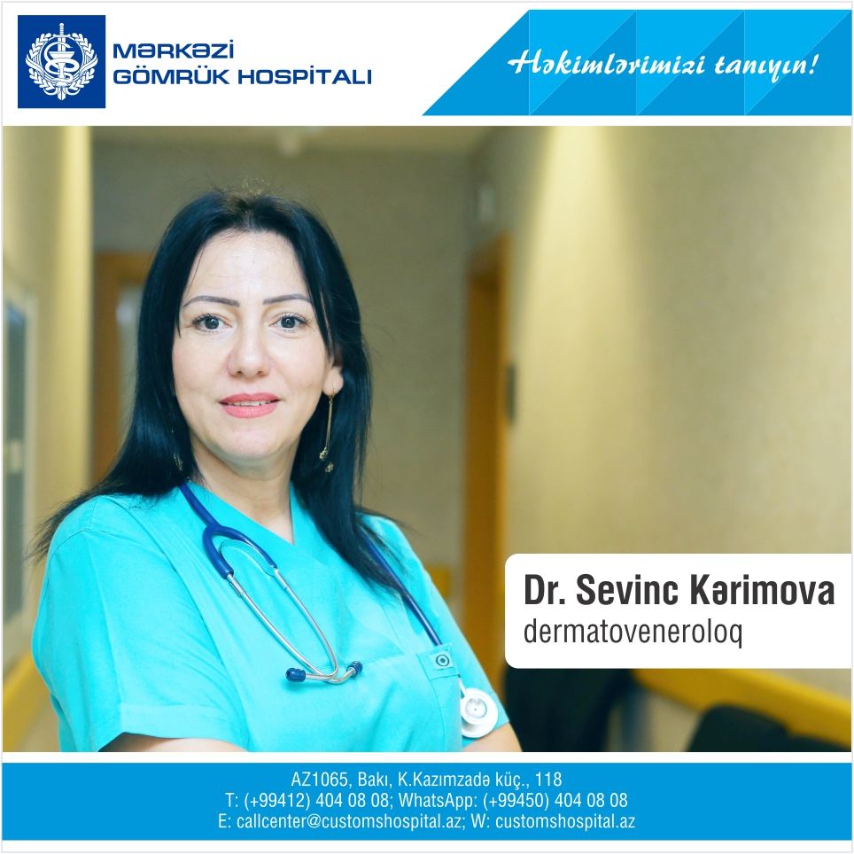 20 ildən artıq müddətdə dəri xəstəliklərinin müalicəsi ilə məşğul olan Dr. Sevinc Kərimovanın iştirakı ilə Mərkəzi Gömrük Hospitalında allergik dermatit və dermatozlar, ekzema, psoriaz, demodekoz, müxtəlif etiologiyalı dəmrovlar, acne vulqaris, ocaqlı alopesiyalar, döyənəklər, dərinin, dırnağın və saçların göbələk xəstəlikləri, zöhrəvi xəstəliklər - xlamidioz, mikoplazma, ureaplazmoz, qonoreya, trixomoniaz, herpes və digər zöhrəvi xəstəliklərin müasir üsullarla diaqnostikası və müalicəsi həyata keçirilir. Həmçinin, viruslu ziyillər, ət xalları adlandırdığımız papilloma, epitelioma, bazalioma və s. dəri törəmələrinin kriodestruksiya üsulu ilə ağrısız, fəsadsız götürülməsi prosedurları icra edilir.