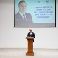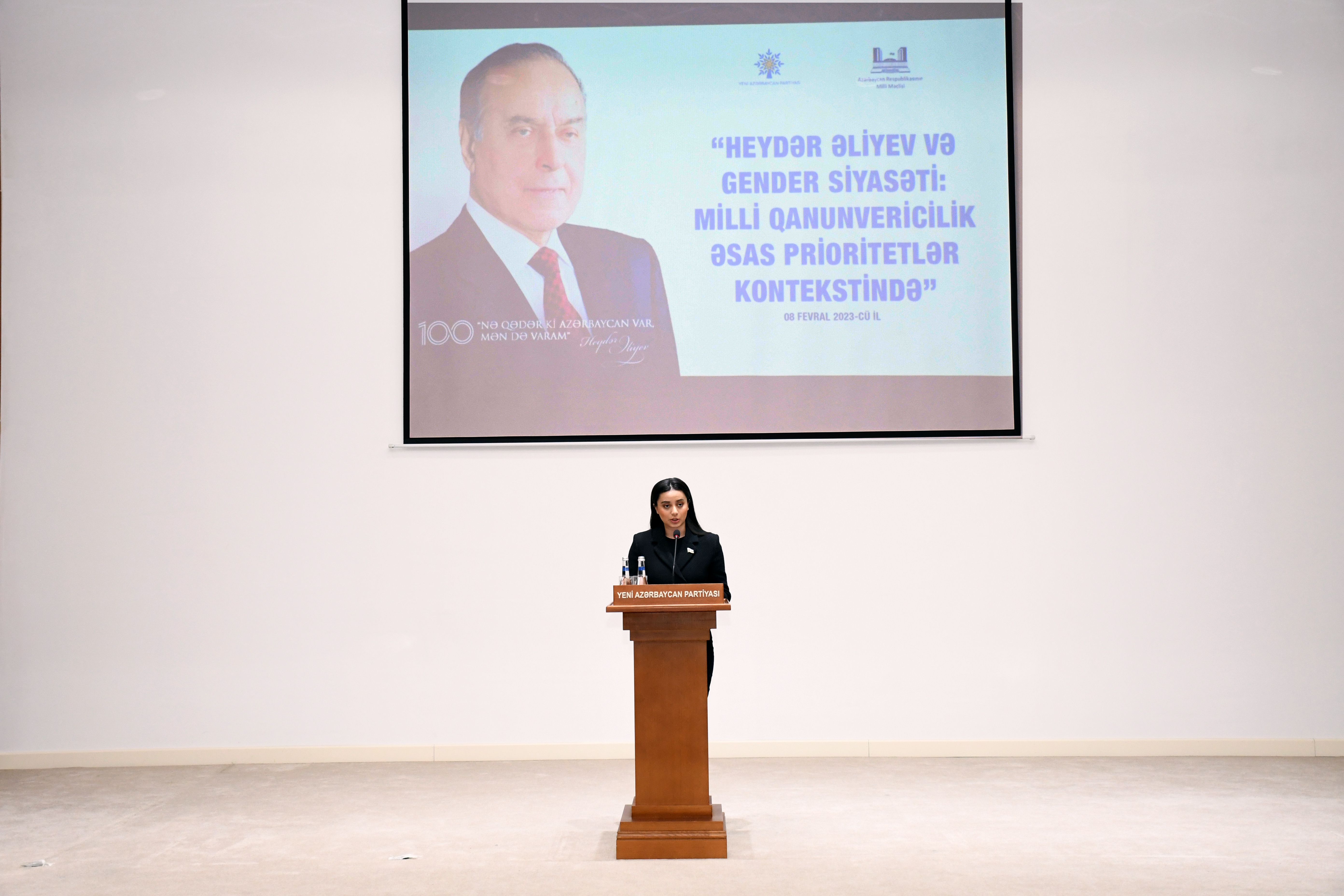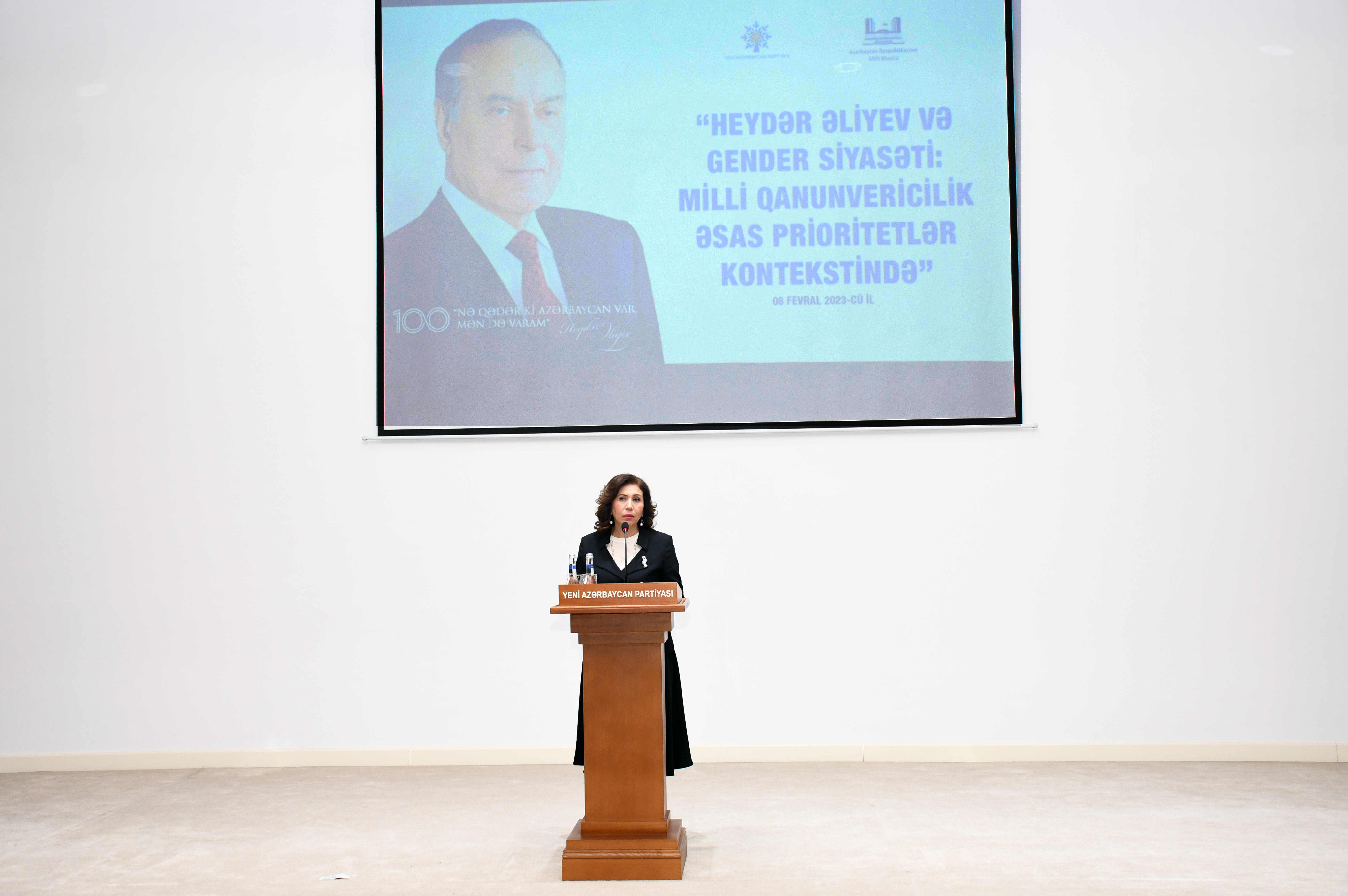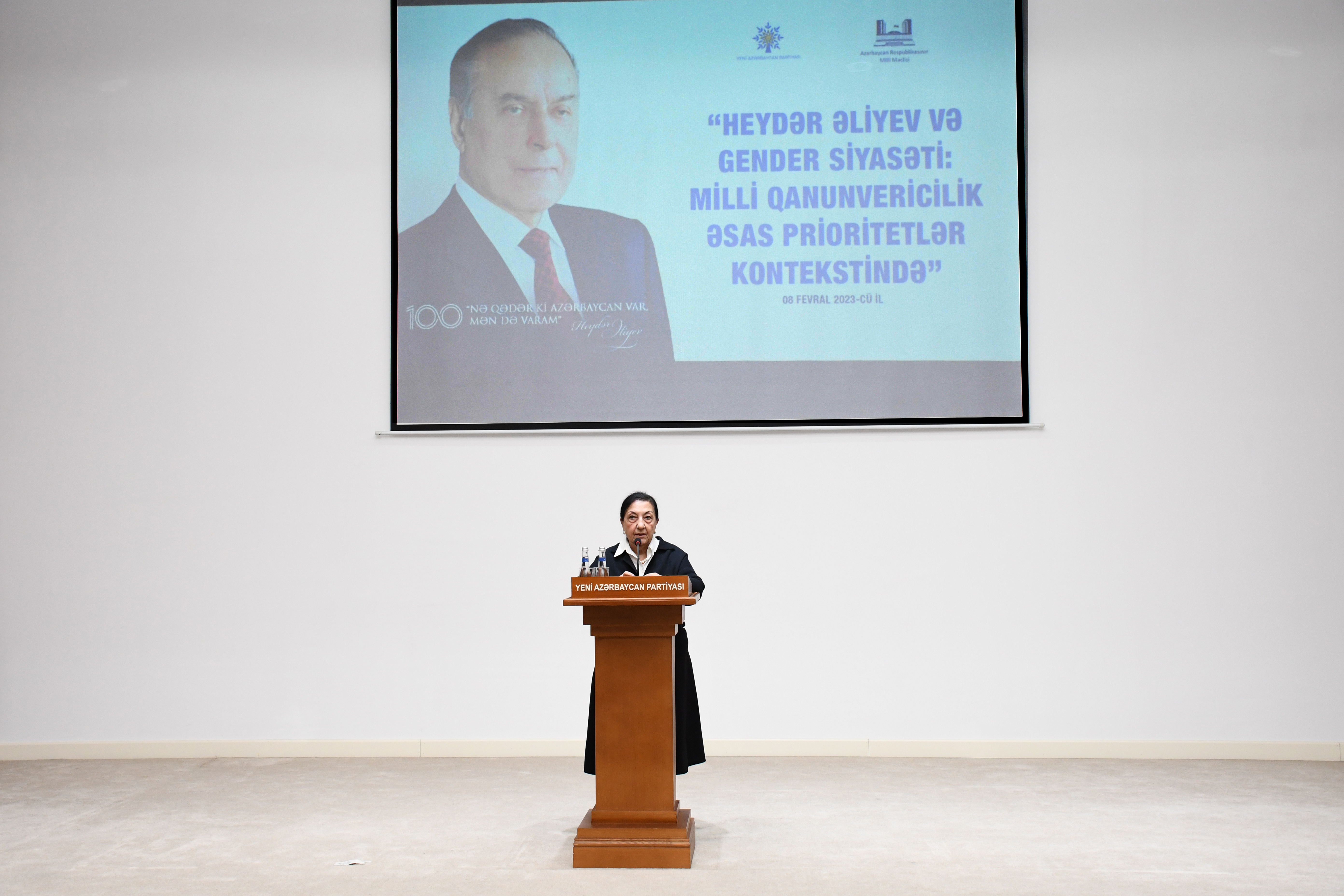 O qeyd edib ki, ümummilli lider Heydər Əliyev Azərbaycanın keçmişini yaşadan və gələcəyini müəyyən edən şəxsiyyətdir: “Ulu Öndər dövlətçiliyimizin daha da möhkəmləndirilməsi, tarixi ənənələrin bərpası, ölkədə demokratiyanın bərqərar olunması istiqamətində əhəmiyyətli və misilsiz işlər görüb. Böyük siyasətçi insan hüquqları çərçivəsində qadın hərəkatının inkişafına da güclü stimul vermişdir. Ölkəmizdə dövlət qadın siyasətinin əsas prinsiplərinin müəyyən edilməsi və bu sahədə qanunvericilik bazasının formalaşması məhz Heydər Əliyevin adı ilə bağlıdır. Heydər Əliyev 1969-cu ildə respublikamıza ilk dəfə rəhbər təyin edildiyi vaxtdan etibarən fəaliyyətinin hər dövründə qadın haqlarının müdafiəçisinə çevrilib. Ulu Öndər müstəqillik dövründə qadın hüquqlarının qorunması üçün bir çox hüquqi-normativ aktlar, qanunlar təsdiqləyib, mühüm sərəncam və fərmanlar imzalayıb. Azərbaycan Respublikasının ali hüquqi sənədi olan Konstitusiya heç bir ayrı-seçkiliyə yol vermədən hər kəsin hüquq və azadlıqlarının bərabərliyinə təminat verir. Məhz Heydər Əliyevin müəllifi olduğu Azərbaycan Konstitusiyasında qadınların kişilərlə bərabərhüquqlu olması təsdiq edilib və qeyd olunub ki, ölkədə kişi ilə qadının eyni hüquq və azadlıqları vardır. Bununla da demokratik cəmiyyət quruculuğunda qadınların iştirakının hüquqi bazası yaradılıb. Bu isə öz növbəsində ictimai-siyasi həyatımızın bütün sferalarında gender siyasətinin güclənməsinə gətirib çıxarmışdır. Hüquq bərabərliyi bir sıra məcəllələrlə, o cümlədən Ailə, Mülki, Əmək, Cinayət, İnzibati Xətalar Məcəllələrlə və digər qanunlarla təsbit olunub”.