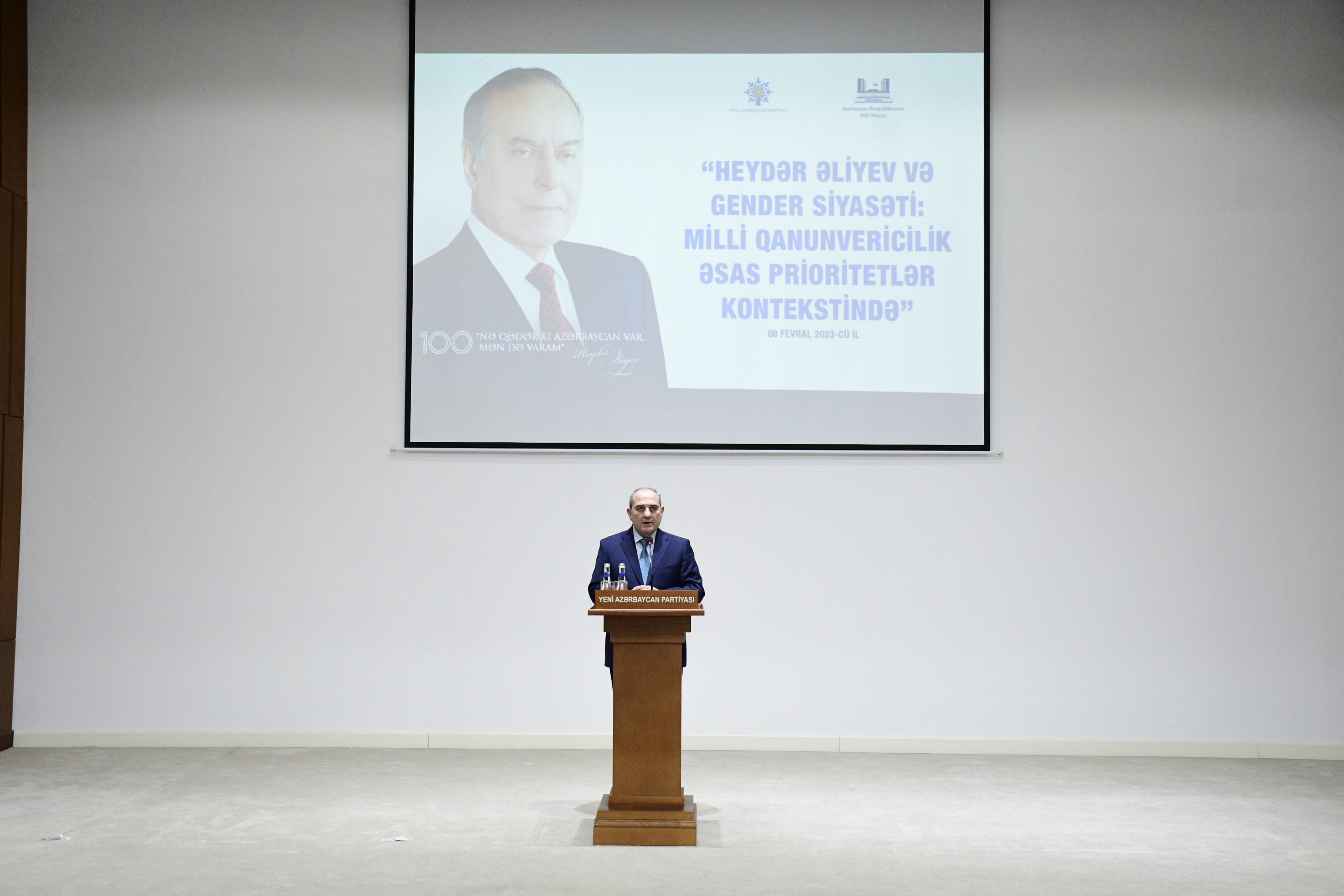 “Heydər Əliyev İli” çərçivəsində Yeni Azərbaycan Partiyasının Mərkəzi Aparatı və Milli Məclisin Ailə, qadın və uşaq məsələləri komitəsinin birgə təşkilatçılığı ilə “Heydər Əliyev və gender siyasəti: milli qanunvericilik əsas prioritetlər kontekstində” mövzusunda keçirilən bugünkü tədbirimiz də Ümummilli Liderin ideya-siyasi xəttinin, zəngin dövlətçilik irsinin, əbədiyaşar ideyalarının öyrənilməsi və yeni nəslə aşılanması baxımından mühüm əhəmiyyətə malikdir. İnkaredilməz həqiqətdir ki, Heydər Əliyev tarixi və siyasi ənənələrə, milli-mənəvi və ümumbəşəri dəyərlərə xüsusi önəm verməklə yanaşı, yenilikçi, mütərəqqi baxışlara əsaslanan çox mühüm təşəbbüslər irəli sürüb, vacib addımlar atıb. Onun xalqımızın zəngin ənənələrinə və dəyərlərinə, dövlətçilik maraqlarına uyğun və dövrün çağırışlarına adekvat cavab verən gender siyasəti də bu baxımdan xüsusi vurğulanmalıdır”,- deyən Tahir Budaqov vurğulayıb ki, gender siyasəti Heydər Əliyevin demokratik, hüquqi dövlət və müasir cəmiyyət quruculuğunun, insan hüquqları və azadlıqlarının qorunması siyasətinin tərkib hissəsi kimi mühüm əhəmiyyətə malikdir. Gender bərabərliyi üçün hüquqi bazanın və ictimai-siyasi əsasların yaradılması, qadın hüquqlarının qorunması və qadınların cəmiyyət həyatının müxtəlif sahələrində yüksək fəallığının təmin olunması vacib prioritetlərdən biri kimi müəyyənləşdirilmiş, bu istiqamətdə ardıcıl tədbirlər həyata keçirilmişdir. Xüsusi qeyd etmək lazımdır ki, “Azərbaycan qadını öz ağlı, zəkası, müdrikliyi, sədaqəti, qəhrəmanlığı, vəfası, yüksək analıq keyfiyyəti ilə bizim xalqımızı, millətimizi daim ucaldıbdır”,- deyən Heydər Əliyev hələ sovetlər birliyi dönəmində respublikamıza rəhbərlik etdiyi vaxt gender bərabərliyinə, qadınların elm, təhsil, mədəniyyət və digər sahələrdə rolunun artırılmasına, idarəetmənin müxtəlif istiqamətlərində fəal təmsil olunmasına xüsusi diqqət yetirmişdir. Eyni zamanda, öz üzərinə düşən vəzifələri müvəffəqiyyətlə yerinə yetirərək respublikanın inkişafına layiqli töhfələr verən qadınların səmərəli fəaliyyətinin davamlı olması üçün Heydər Əliyev önəmli stimullaşdırıcı tədbirlər həyata keçirmişdir. Peşə fəaliyyətində fərqlənən qadınların mükafatlandırılması, müxtəlif adlarla təltif olunması və bir sıra digər addımlar bu baxımdan böyük əhəmiyyətə malik olmuşdur.