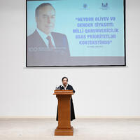 Konfransda Ailə, Qadın və Uşaq Problemləri Komitəsinin sədri, YAP İdarə Heyətinin üzvü Bahar Muradova “Azərbaycanda dövlət qadın siyasətinin əsasları” mövzusunda çıxış edərək bildirib ki, bu il respublikamızda və ölkəmizdən kənarda “Heydər Əliyev İli” çərçivəsində çoxsaylı tədbirlərin təşkil olunması ilə əlamətdardır: “Demək olar ki, ölkəmizlə əlaqəsi olan hər kəs bu il Heydər Əliyevin Azərbaycan dövlətçiliyi tarixində, xalqımızın həyatında oynadığı rol, Onun xidmətləri, fədakarlığı nəticəsində müasir Azərbaycan dövlətinin qurulması kimi bağlı mövzular ətrafında danışır, fikir mübadiləsi edir. Hər kəs çox böyük minnətdarlıq və ehtiram hissi ilə böyük şəxsiyyət Heydər Əliyevi yad edir, Onun xatirəsi qarşısında baş əyir və dahi Liderin xidmətlərindən doğan öhdəliklərini, məsuliyyətlərini dərk edərək sabaha böyük inamla baxır. Ona görə inamla baxırlar ki, Azərbaycanın müstəqilliyinin bərpası dönəmində və ona qədərki dövrdə Heydər Əliyev bir insanın, şəxsiyyətin, Liderin öz xalqı və dövləti üçün edə biləcəyi mümkün nə varsa, hamısını etməyin nümunəsini və örnəyini yaradıb. Bu baxımdan, Heydər Əliyev və Azərbaycan mövzusu hər zaman tədqiqat obyekti olacaq və bizim hər birimizin vəfa borcudur ki, bununla bağlı həm fəaliyyətimizdə, həm də onun müxtəlif aspektlərini geniş ictimaiyyətə çatdırmaq istiqamətində işimizi düzgün quraq. Hesab edirəm ki, bu konfrans məhz bu vəzifələrə cavab verən çox gözəl bir tədbirdir. Burada Heydər Əliyev və Azərbaycanda gender siyasəti, xüsusilə onun qanunvericilik kontekstində araşdırılması ilə bağlı bir sıra fikirlər səsləndirildi. Əlbəttə, əgər bunu biz konkret qanunların qəbulu və onun icrası ilə bağlı qəbul edilən fəaliyyət planları, dövlət proqramlarından kənar ümumilikdə dəyərləndirmək istəsək, onu bir neçə dövrə bölmək olar. Həmçinin tədbirdə səsləndirildiyi kimi, Azərbaycanın həyatının ən çətin məqamlarında Heydər Əliyev bütün sahələrdə olduğu kimi, bu sahədə də vacib qərarların qəbulu ilə tarixə düşüb”.