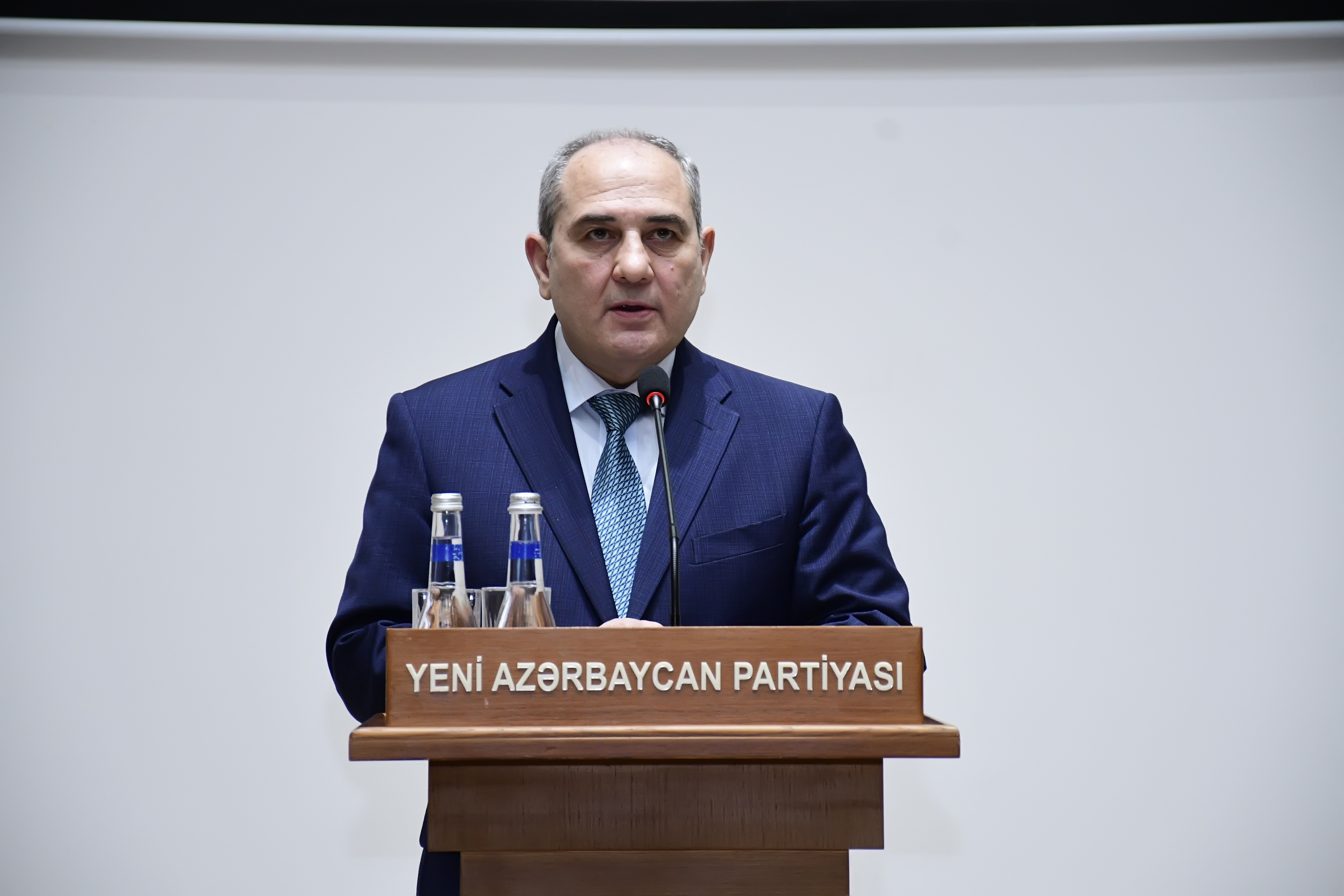 Konfransda giriş nitqi ilə çıxış edən YAP Sədrinin müavini-Mərkəzi Aparatın rəhbəri Tahir Budaqov xatırladıb ki, Prezident İlham Əliyevin sərəncamı ilə 2023-cü il Azərbaycan Respublikasında “Heydər Əliyev İli” elan edilmişdir. Təsdiq olunmuş Tədbirlər Planına əsasən Ümummilli Liderin zəngin həyat yolunun və müstəsna fəaliyyətinin bütün mərhələlərinin dərindən öyrənilməsi, Heydər Əliyev irsinin və ideyalarının geniş ictimaiyyətə çatdırılması məqsədilə il ərzində ölkə ərazisində və respublikamızın hüdudlarından kənarda çoxsaylı tədbirlər keçiriləcəkdir. Tahir Budaqov vurğulayıb ki, Ulu Öndərin siyasi mirası olan, onun ideyaları əsasında və Prezident İlham Əliyevin rəhbərliyi ilə şərəfli inkişaf yolu keçən və tarixi nailiyyətlər qazanaraq ümumxalq partiyasına çevrilən Yeni Azərbaycan Partiyasının Mərkəzi Aparatı tərəfindən “Heydər Əliyev İli” ilə əlaqədar Tədbirlər Planı hazırlanmış və İdarə Heyətinin qərarı ilə təsdiq edilmişdir: “Tədbirlər Planı çərçivəsində Heydər Əliyev şəxsiyyətinin müasir dövlətçilik tariximizdə müstəsna yerinin və rolunun tədqiq olunması, müstəqil Azərbaycanın inkişaf yolunun hərtərəfli öyrənilməsi və təbliği məqsədilə il ərzində müsabiqələrin, aksiyaların, görüşlərin, elmi-praktik konfransların və digər bir sıra tədbirlərin keçirilməsi nəzərdə tutulmuşdur. Xüsusi vurğulamaq istəyirəm ki, Ulu Öndərin “Nə qədər ki Azərbaycan var, mən də varam” kəlamı “Heydər Əliyev İli” ilə əlaqədar keçiriləcək bütün tədbirlərimizdə istifadə etmək üçün deviz olaraq seçilmişdir. Çünki Heydər Əliyevin vaxtilə dahiyanə şəkildə ifadə etdiyi bu fikir müasir Azərbaycanın timsalında öz təsdiqini tapır. İstər SSRİ dönəmində, istərsə də müstəqilliyin bərpasından sonra Azərbaycanın inkişaf yoluna nəzər saldıqda görürük ki, ölkəmizin qurtuluşu və tərəqqisi bilavasitə Heydər Əliyevin adı və siyasəti ilə bağlıdır. Azərbaycanın bütün uğurlarında Ulu Öndərin imzası, irsi və ideyaları öz əksini tapmışdır. Heydər Əliyev məqsədyönlü və uzaqgörən siyasət həyata keçirməklə bütün sahələrdə parlaq nailiyyətlərin qazanılmasını təmin edərək yeni Azərbaycan reallığını və ölkəmizin parlaq gələcəyinin etibarlı bünövrəsini yaratmışdır”.