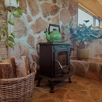 Müxtəlif şkaflar və çekmeceler də quraşdırılıb. Kempervanı odunla işləyən soba qızdırır.