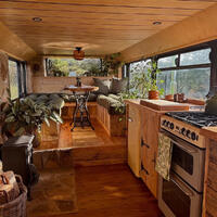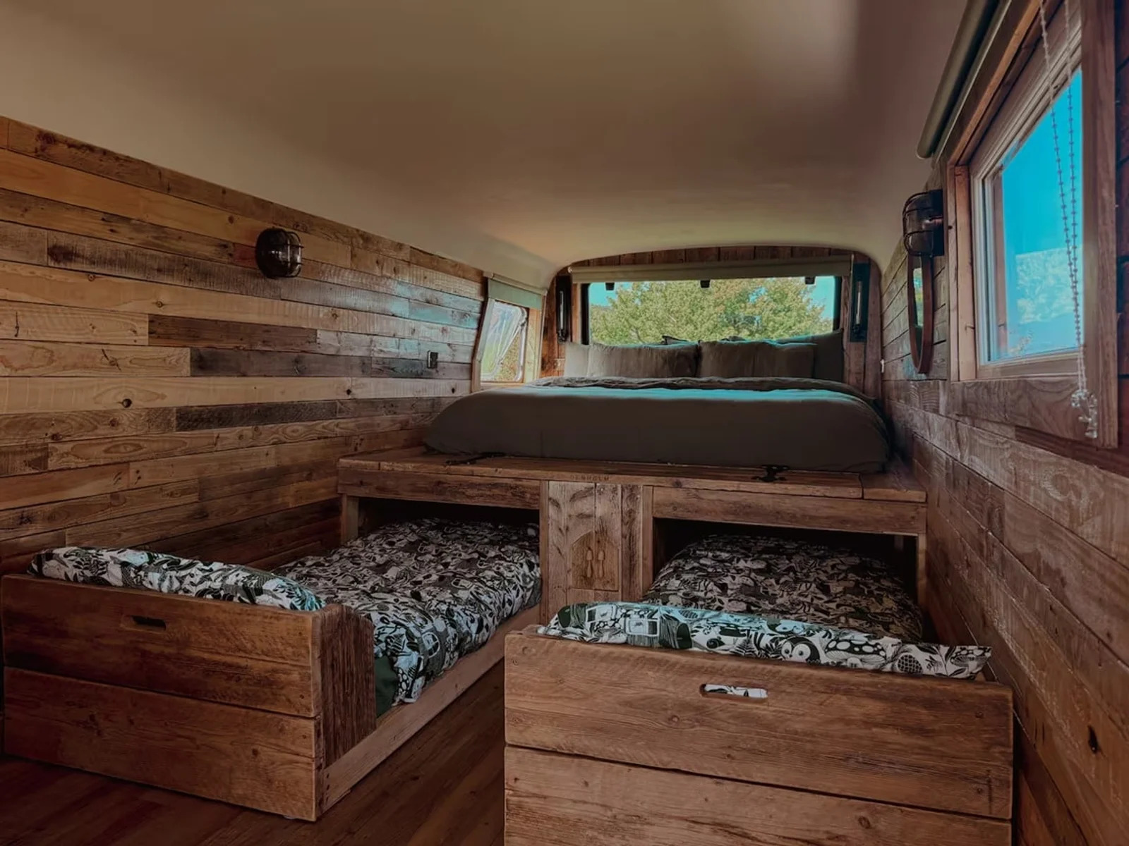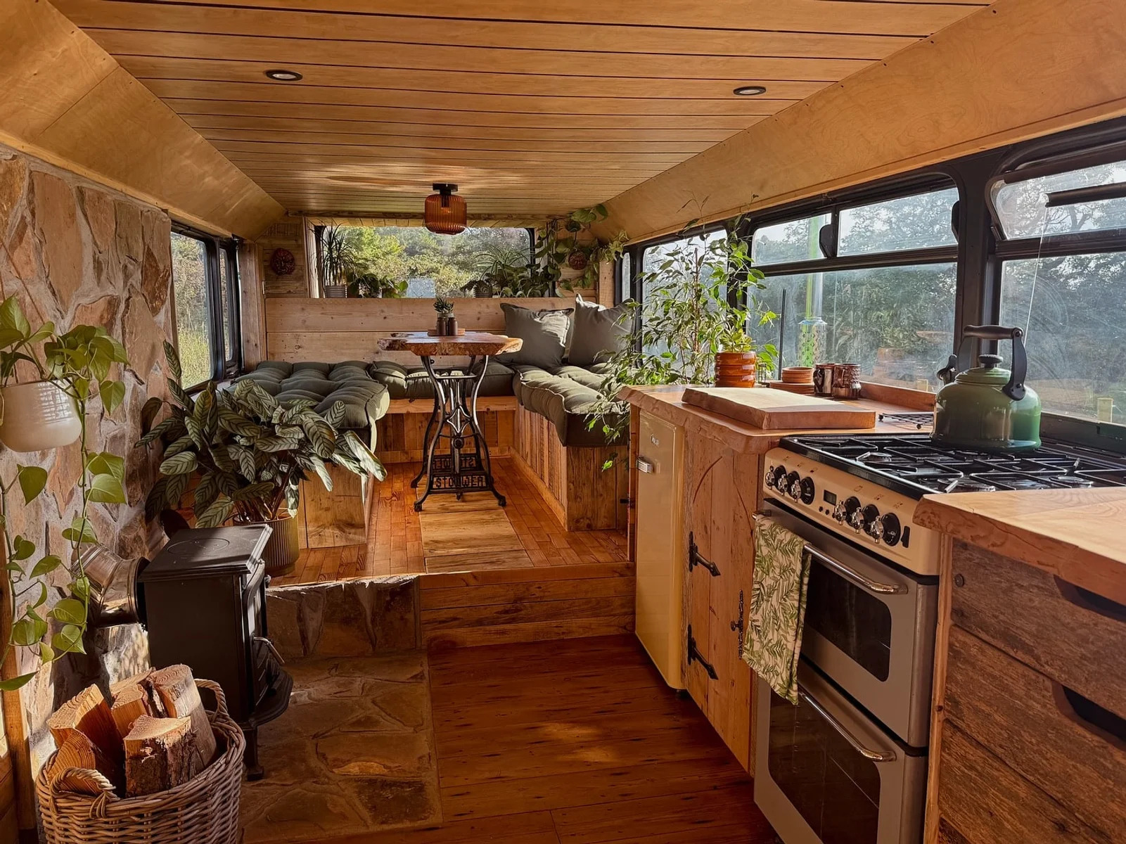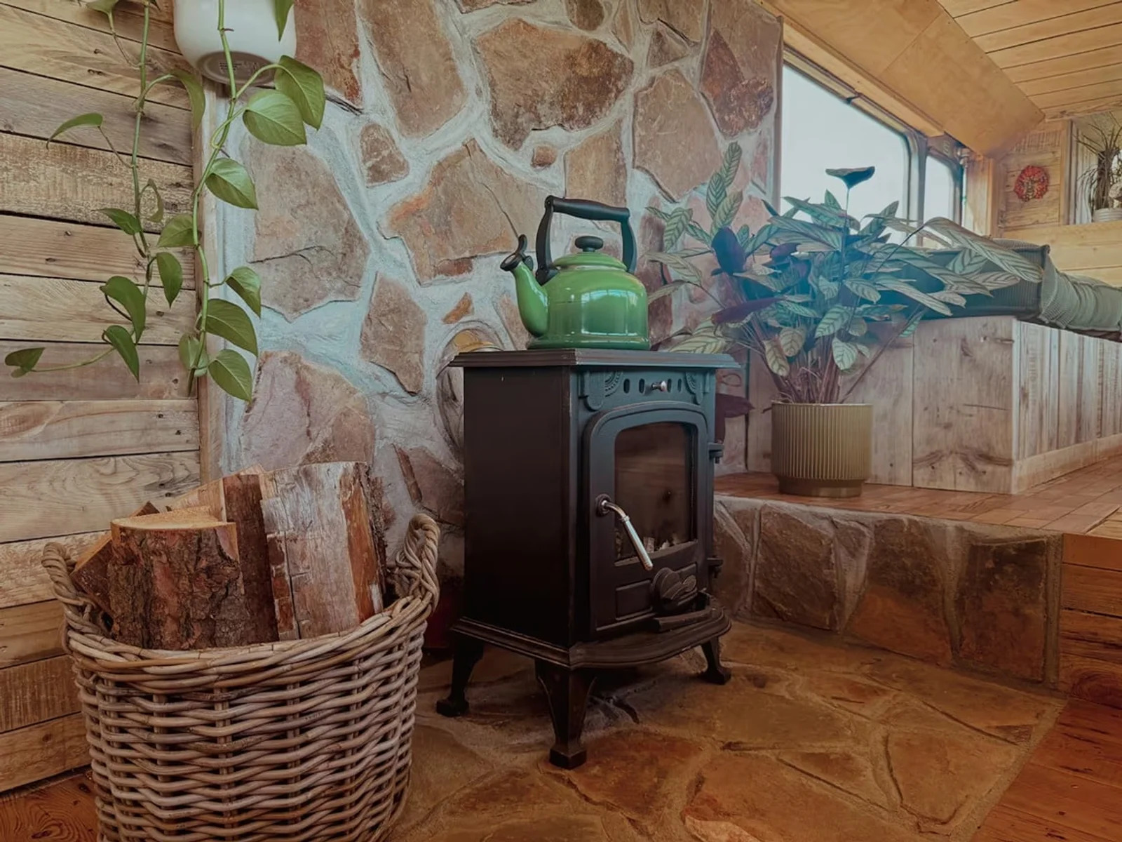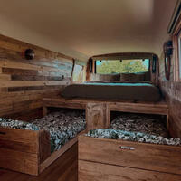 Kempervan yaşıl rəngə boyanıb və interyeri taxta və dekorativ daşlarla bəzədilib.