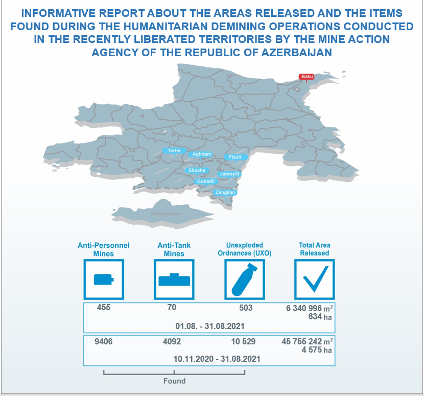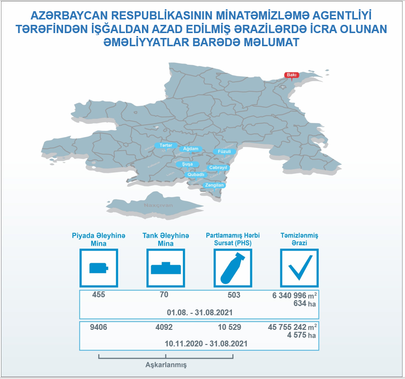 ANAMA-dan SİA-ya bildirilib ki, avqustun 1-dən 31-nə qədər Tərtər, Ağdam, Füzuli, Şuşa, Qubadlı, Cəbrayıl və Zəngilanda 455 piyada əleyhinə mina, 70 tank əleyhinə mina və 503 Partlamamış Hərbi Sursat (PHS) aşkarlanıb.