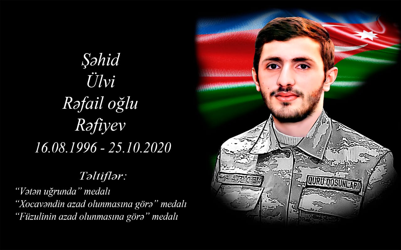 Bax, ruhundan köklənəcəyimiz həmin şəhidlərdən biri də Ülvi Rəfail oğlu Rəfiyevdir. Mən də onun haqqında bu elegiyanı yazıram ki, bu igidimiz qoy tarixdə əbədi qalsın. İlk öncə vurğulayın ki, Ülvi Rəfiyev, Sovet İttifaqı Qəhərəmanı Nəcəfqulu Rəfiyevin kökündəndir. Nəcəfqulu Rəcəb oğlu Rəfiyev 1915-ci ilin mart ayının 22-də Ordubad şəhərində anadan olmuşdu. 1935-ci ildə Sovet Ordusu sıralarına çağrılmış və 1937-ci ildə ali hərbi məktəbdə təhsil almağa başlamışdı. Faşist Almaniyasının SSRİ-yə hücum etməsindən 4 gün keçdikdən sonra sürücü-mexanik, tank komandiri, tank vzvodunun komandiri kimi Cənub-Qərb, Şimali Qafqaz, 1-ci Belorusiya cəbhələrində alman faşist işğalçılarına qarşı vuruşmalarda iştirak etmişdi Nəcəfqulu Rəfiyev. O, 1944-cü ilin yayında Minsk şəhəri yaxınlığında gedən vuruşmalarda, Baronoviçi şəhərinin azad edilməsində şücaət və qəhrəmanlıq göstərmişdi. SSRİ Ali Soveti Rəyasət Heyyətinin 1944-cü il 9 sentyabr tarixli fərmanı ilə Sovet İttifaqı Qəhrəmanı adına layiq görülmüşdü. Müharibədən sonra müxtəlif hərbi hissələrdə qulluq edən Nəcəfqulu Rəfiyev, 1955-1959 -cu illərdə Lənkəran hərbi komissarlığında şöbə rəisi, Culfa rayon hərbi komissarı işləmişdi. 1959-cu ildə ordudan tərxis olunmuş, Azərbaycan SSR Avtomobil Nəqliyyatı sistemində əmək fəaliyyətini davam etdirmişdi.O, 1970-ci ilin dekabr ayının 24-də vəfat edib və Fəxri Xiyabanda dəfn olunub. Bəli. Ülvi də bu nəslin nümayəndəsi idi. Amma o, çox qısa ömür yaşadı. Ülvu Rəfael oğlu Rəfiyev bu qısa və mənalı ömrü ilə adını millətimizin tarixinə əbədi yazdı. O, 16 avqust 1996-cı ildə Ordubad rayonunda anadan olmuşdu. 2002-ci ildə Bakı şəhəri Xətai rayonu 263 saylı tam orta məktəbin 1-ci sinifinə daxil olmuş, 2013-cü ildə həmin məktəbi yaxşı qiymətlərlə bitirib, 409 balla Azərbaycan Dövlət Neft Akademiyasına (indiki ADNSU) daxil olmuşdu.