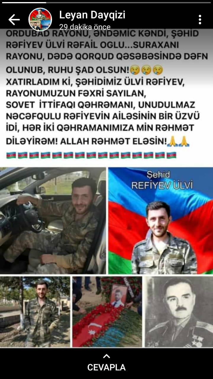 Qəhərmanı Nəcəfqulu Rəfiyevin igidliyini bir daha təkrar etdin. Və sübut elədin ki, Rəfiyevlər nəsli qəhrəman nəsil olub və həmişə də qəhrəmanlar nəsli olaraq qalacaq. Qəhrəmanlığın mübarək Ülvi Rəfael oğlu Rəfiyev.