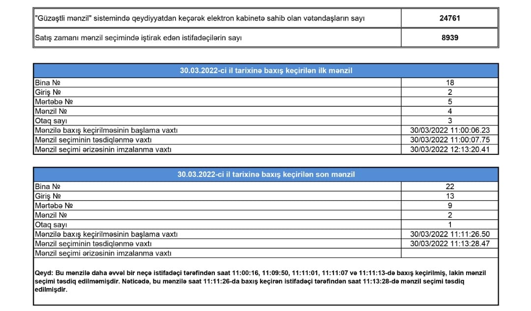 Bugünkü satış zamanı 442 mənzilin seçimində iştirak edənlərin sayı 8 939 nəfər olmuşdur. Bu saata olan məlumata görə seçilmiş 442 mənzilin 257-i vətəndaşlar tərəfindən uğurla imzalanaraq ərizələri təqdim edilmişdir.