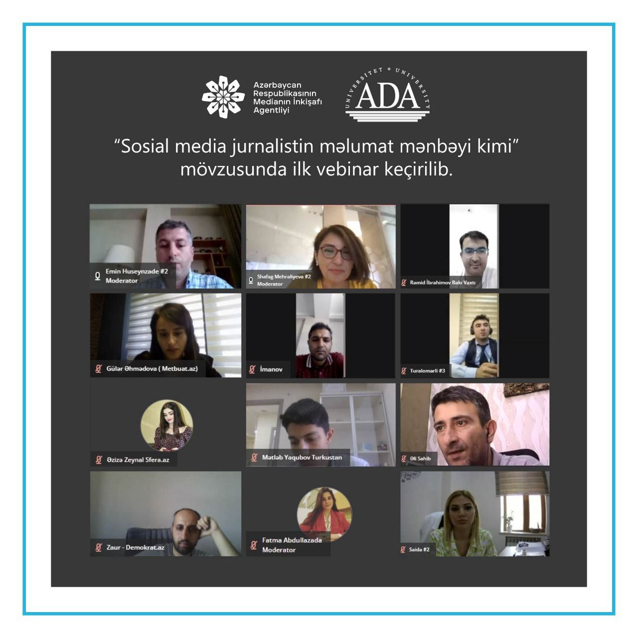 İyunun 14-də Medianın İnkişafı Agentliyinin və ADA Universitetinin Kommunikasiya və Rəqəmsal Media proqramının birgə təşkilatçılığı ilə “Sosial media jurnalistin məlumat mənbəyi kimi” mövzusunda ilk vebinar keçirilib. SİA-nın verdiyi məlumata görə, vebinarda müxtəlif media subyektlərinin nümayəndələri, jurnalistika ixtisasında təhsil alan və jurnalistikaya marağı olan tələbələr, həmçinin Media könüllüləri iştirak edib.