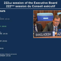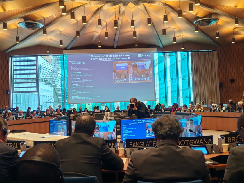 UNESCO-nun mənzil-qərargahında təşkilatın İcraiyyə Şurasının 222-ci sessiyasının plenar iclasında ölkəmizin UNESCO yanında daimi nümayəndəsi Elman Abdullayev Azərbaycanın bəyanatını səsləndirib. SİA xəbər verir ki, bəyanatda Azərbaycanın İcraiyyə Şurasında dördillik üzvlüyü dövründə həyata keçirdiyi aktiv fəaliyyəti haqqında məlumat verilib. Ölkəmizin bundan sonra da UNESCO platformasında fəal iştirak etməyə və təşkilatın mandatına töhfə verməyə davam edəcəyi vurğulanıb.