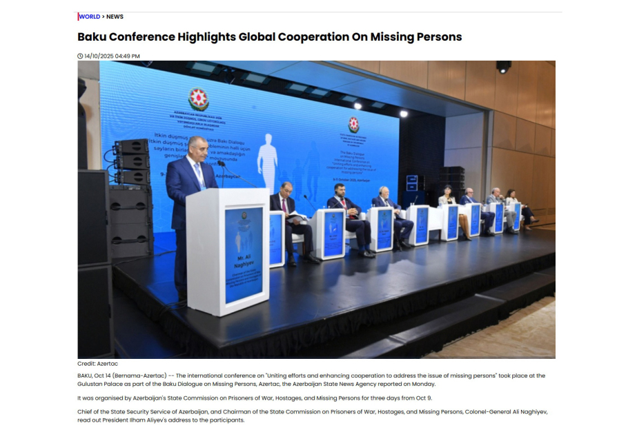 Malayziyanın ən böyük xəbər agentliyi olan BERNAMA dövlət informasiya agentliyi İtkin düşmüş şəxslər üzrə Bakı Dialoqu çərçivəsində “İtkin düşmüş şəxslər probleminin həlli üçün səylərin birləşdirilməsi və əməkdaşlığın genişləndirilməsi” mövzusunda beynəlxalq konfrans barədə xəbər yayıb. BERNAMA tərəfdaşı olduğu SİA-ya istinadla yazır ki, Azərbaycan Respublikası Əsir və itkin düşmüş, girov götürülmüş vətəndaşlarla əlaqədar Dövlət Komissiyasının təşkilatçılığı ilə keçirilən konfransda Dövlət Təhlükəsizliyi Xidmətinin rəisi, komissiyasının sədri general-polkovnik Əli Nağıyev Prezident İlham Əliyevin konfrans iştirakçılarına müraciətini oxuyub. Qeyd olunub ki, Əli Nağıyev Dövlət Komissiyasında 3 min 990 nəfərin itkin şəxs kimi qeydiyyata alındığını, bu vaxtadək işğaldan azad edilmiş ərazilərdə aparılmış qazıntılar zamanı aşkarlanmış 29 kütləvi məzarlıqdan 218 şəxsə aid olduğu ehtimal edilən meyit qalıqlarının müəyyən olunaraq ekshumasiya edildiyini, 2025-ci ilin oktyabrın 1-nə olan məlumata əsasən, 800-ə yaxın itkin düşmüş şəxsə aid olduğu ehtimal edilən meyit qalıqları aşkarlanaraq işğaldan azad edilmiş ərazilərdən götürüldüyünü vurğulayıb.