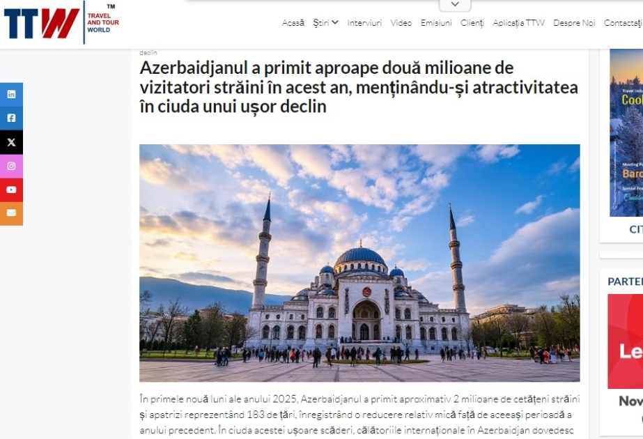Rumıniyanın nüfuzlu “Travel and Tour World” turizm xəbər portalında dərc olunan məlumatlara görə, Azərbaycan bu il turizm sektorunda sabit dinamikanı qoruyub saxlayıb. SİA xəbər verir ki, ilin ilk doqquz ayı ərzində ölkəyə təxminən 2 milyon əcnəbi turist səfər etdiyi bildirilib.