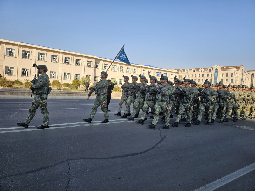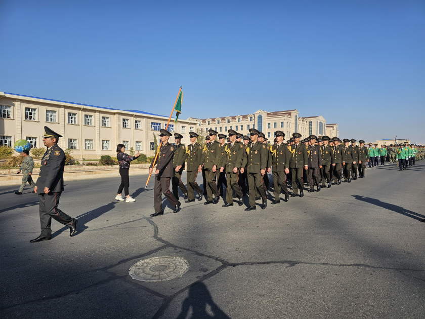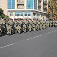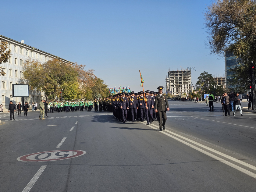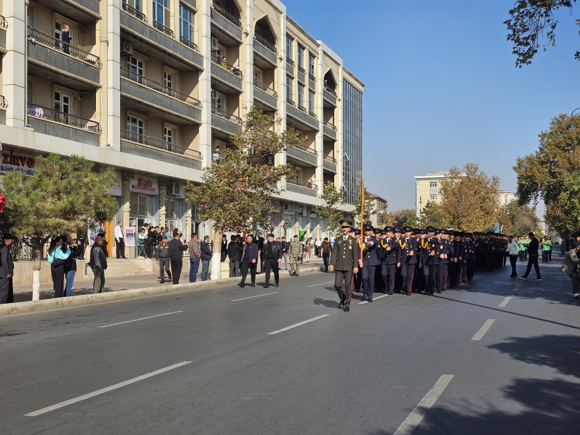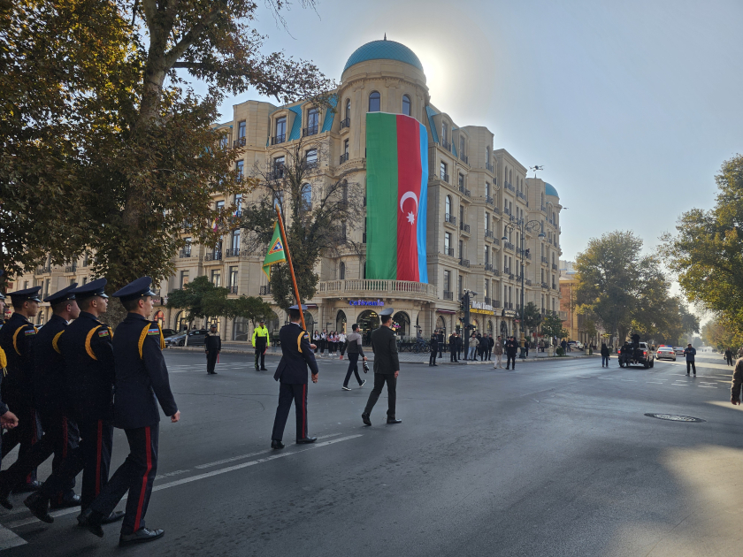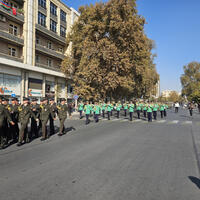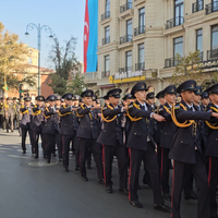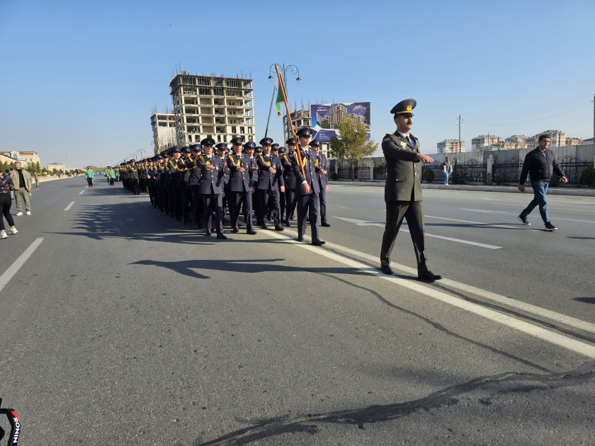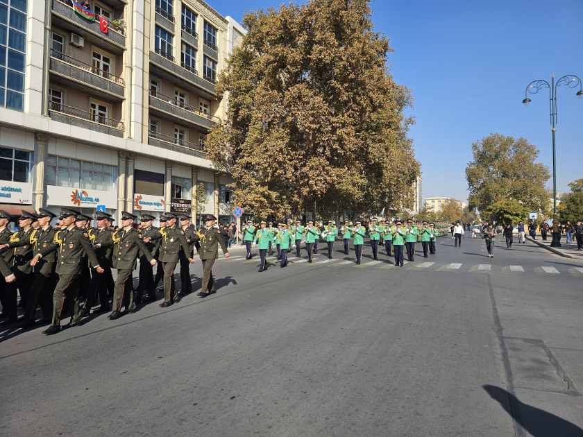 Yürüş iştirakçıları hərbi orkestrin müşayiəti ilə hərbi vətənpərvərlik mahnıları, eləcə də marşlar və şüarlar səsləndiriblər.