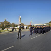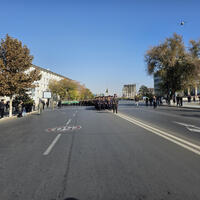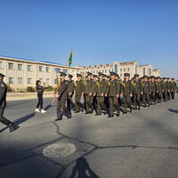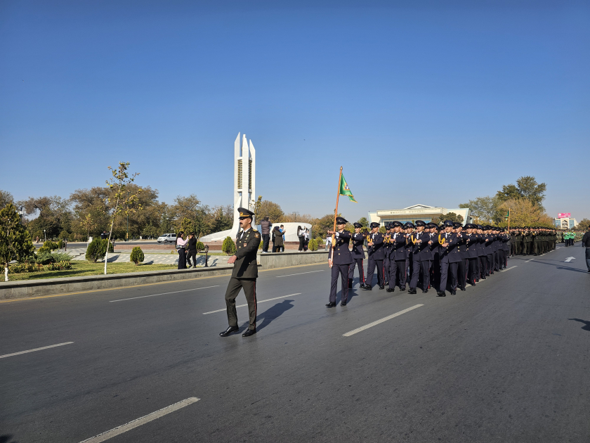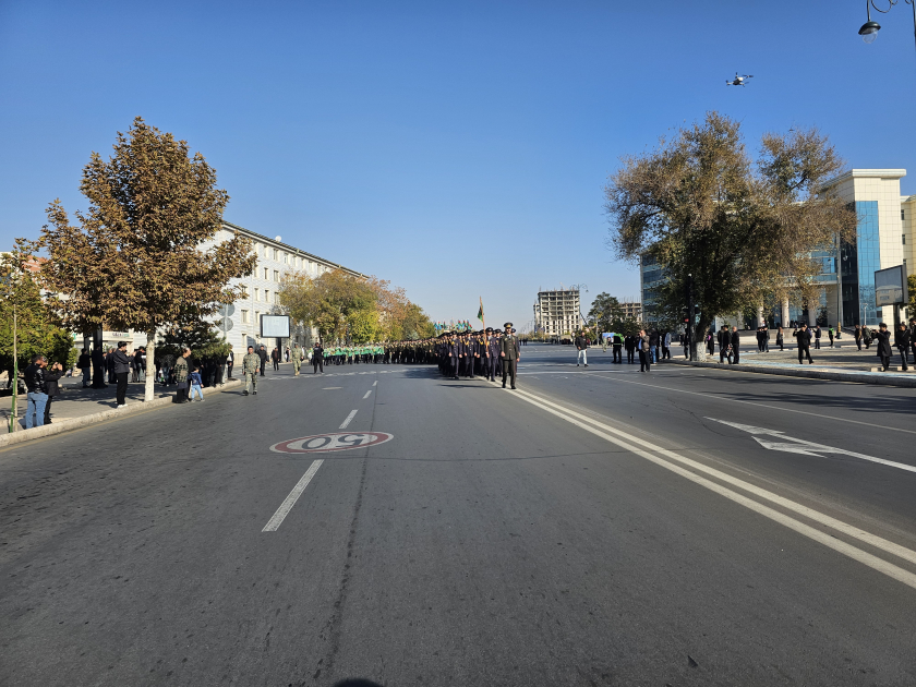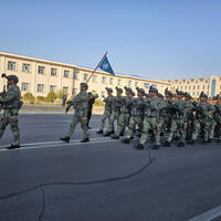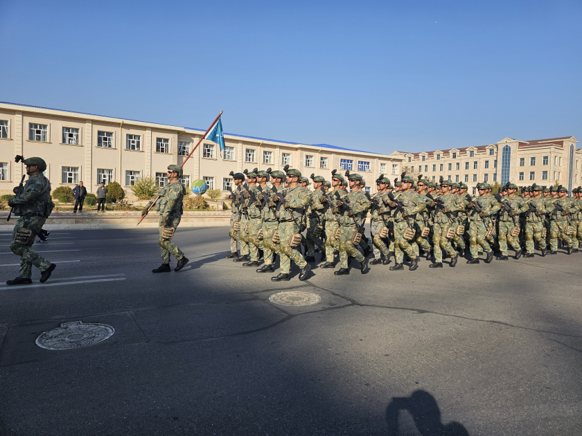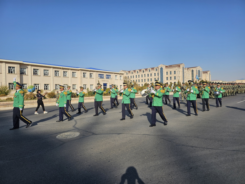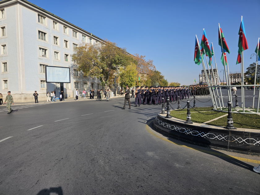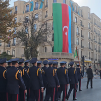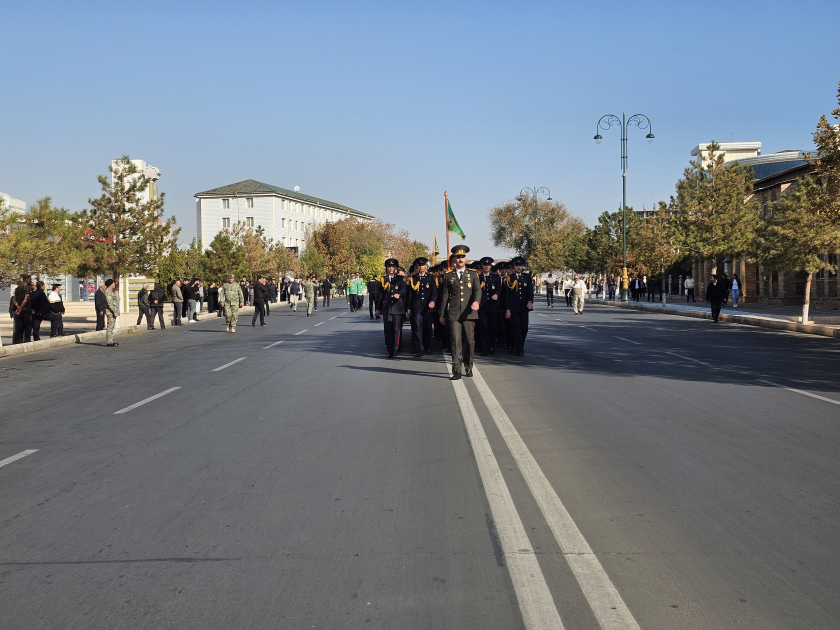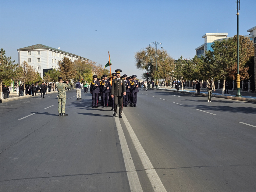 Yürüş iştirakçıları hərbi orkestrin müşayiəti ilə hərbi vətənpərvərlik mahnıları, eləcə də marşlar və şüarlar səsləndiriblər.