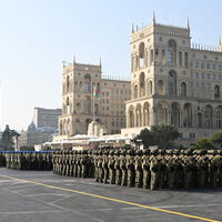 Silahlı Qüvvələrimizin şəxsi heyəti Azərbaycan Respublikasının Dövlət Bayrağı altında tribunaya doğru irəlilədi. Dövlət Bayrağının ardınca Azərbaycan Ordusunun və hərbi əməliyyatlarda xüsusilə fərqlənən birləşmələrin Döyüş bayraqları “Vətənə xidmətə görə” ordenli general-mayor Vüqar Əliverdiyevin başçılığı ilə Azadlıq meydanına gətirildi.