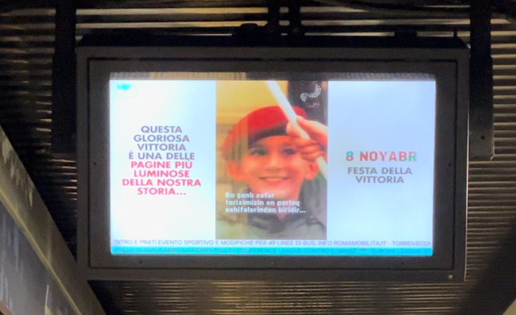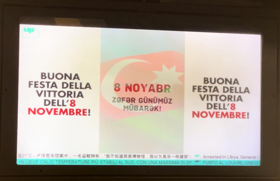 Azərbaycan Respublikasının Diasporla İş üzrə Dövlət Komitəsinin dəstəyi, İtaliya-Azərbaycan Birliyinin təşkilatçılığı ilə Romanın metro stansiyalarında, eləcə də avtobus dayanacaqlarındakı monitorlarda 8 Noyabr – Zəfər Günü münasibətilə genişmiqyaslı məlumatlandırma kampaniyası keçirilir.