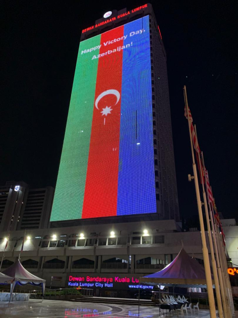 Malayziyada paytaxt Kuala-Lumpur şəhərinin bələdiyyəsi 8 Noyabr - Zəfər Gününün 5-ci ildönümü münasibətilə Azərbaycanla həmrəylik nümayiş etdirib. SİA xəbər verir ki, Kuala-Lumpur şəhər bələdiyyəsinin inzibati binasının möhtəşəm “MENARA-1” qülləsi üzərindəki rəqəmsal ekranda nəhəng Azərbaycan bayrağı proyeksiya edilib. Şanlı üçrəngli bayrağımızın fonunda “Zəfər Günün mübarək, Azərbaycan” sözləri yazılıb.