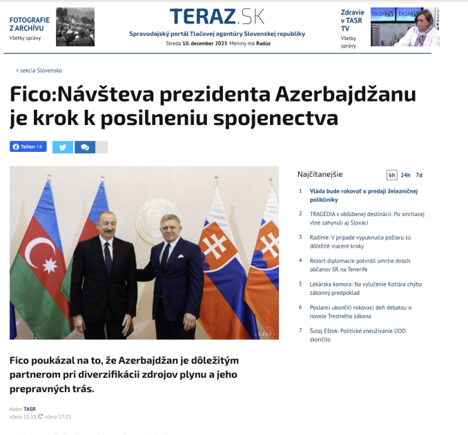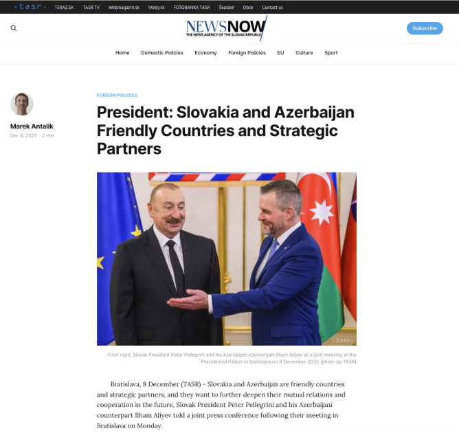 Vurğulanıb ki, Slovakiya Prezidenti Peter Pelleqrini və Baş nazir Robert Fitso ilə danışıqlar dostluq və qarşılıqlı hörmət ruhunda keçib. Prezident Pelleqrini diqqətə çatdırıb ki, Slovakiya Azərbaycanı dost ölkə hesab edir və onu regionun strateji oyunçusu kimi qəbul edir. Prezident İlham Əliyev isə iki ölkə arasında əməkdaşlığın çoxşaxəli potensialını vurğulayıb və Slovakiya ilə münasibətlərin qarşılıqlı maraqlara əsaslandığını qeyd edib.