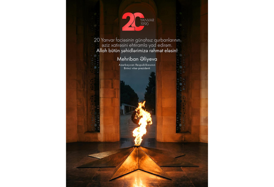 Azərbaycan Respublikasının Birinci vitse-prezidenti Mehriban Əliyeva sosial şəbəkə hesablarında 20 Yanvar faciəsinin 36-cı ildönümü ilə bağlı paylaşım edib. SİA xəbər verir ki, paylaşımda deyilir: “20 Yanvar faciəsinin günahsız qurbanlarının əziz xatirəsini ehtiramla yad edirəm. Allah bütün şəhidlərimizə rəhmət eləsin!”.