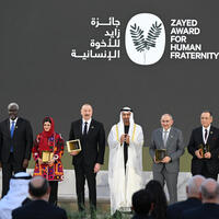 Hörmətli qonaqlar, müqəddəs Papa XIV Leonun və Əl-Əzhər Şərifin şeyxi Əhməd Əl-Tayyibin xeyir-duaları ilə fəaliyyət göstərən müstəqil Zayed Beynəlxalq Mükafatının rəhbərliyi tərəfindən qaliblərin seçilməsi beynəlxalq səviyyədə yüksək etirafın göstəricisidir. Bu, sülhə və insan ləyaqətinə xidmət edən işlərin dərin bəşəri dəyərini təsdiqləyir.